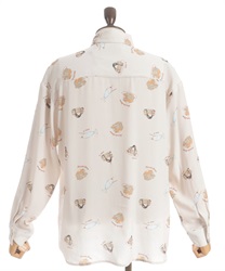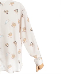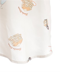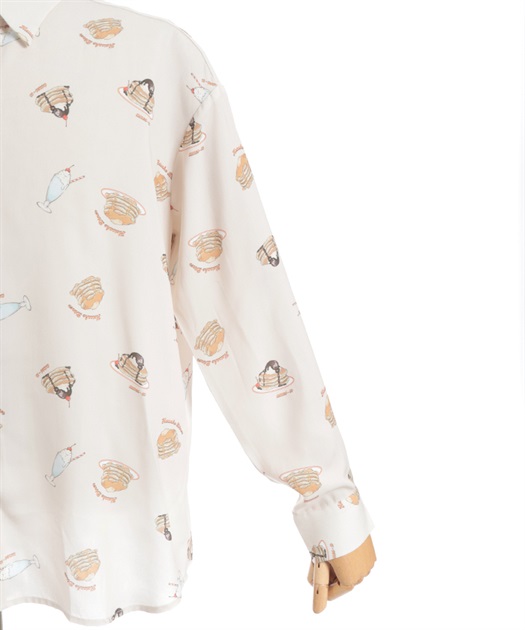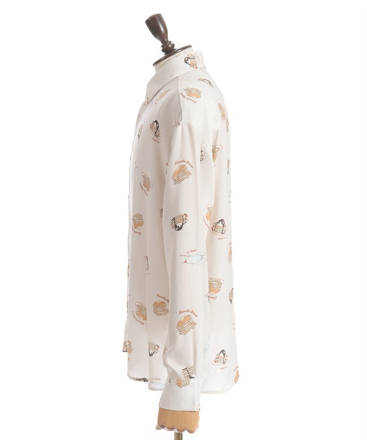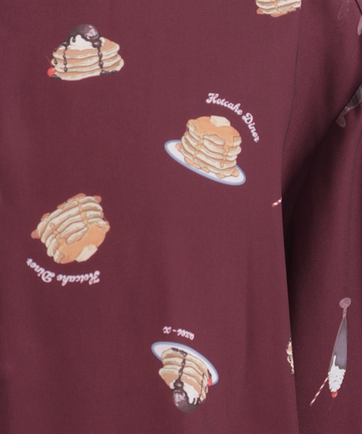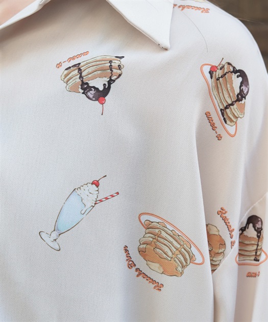 チョコソースとメープルシロップの2種類のパンケーキとミルクセーキのプリントが、ポップな雰囲気に。
