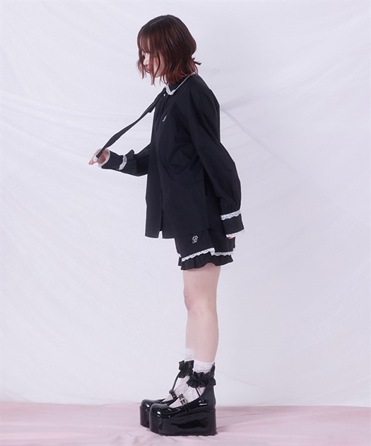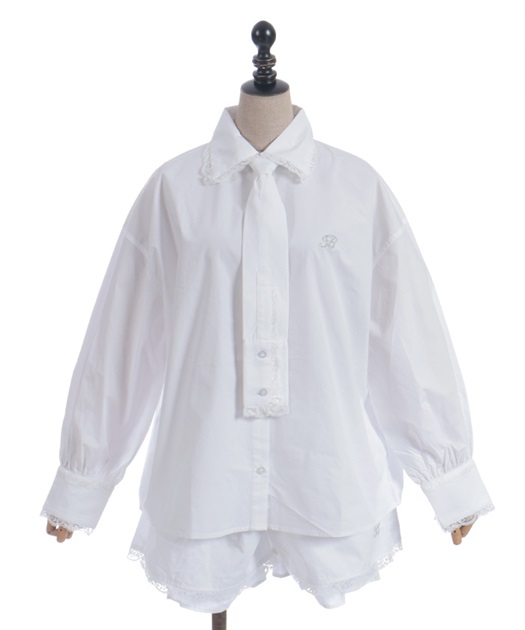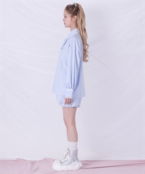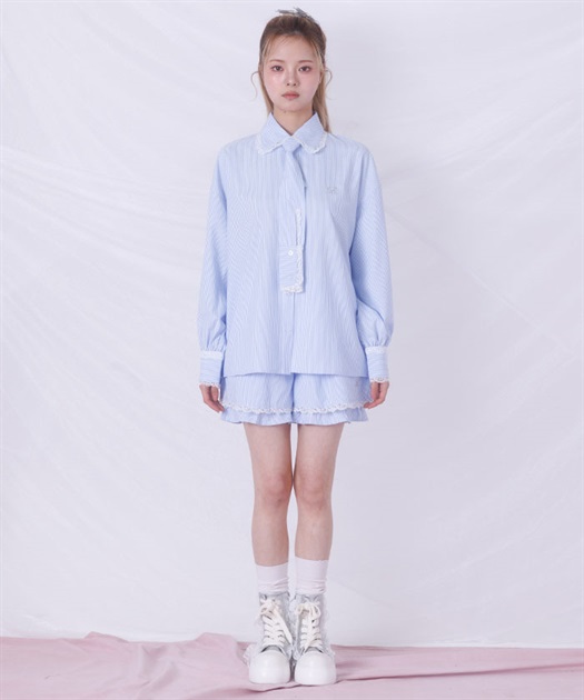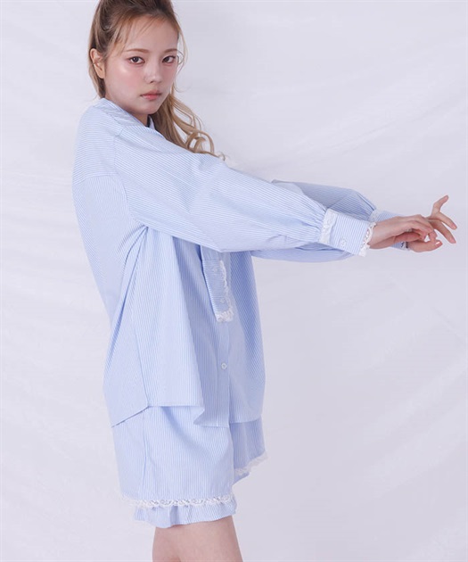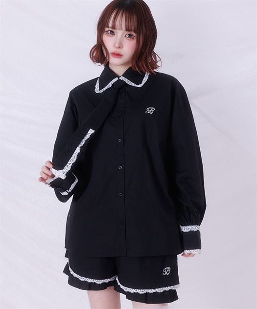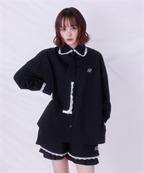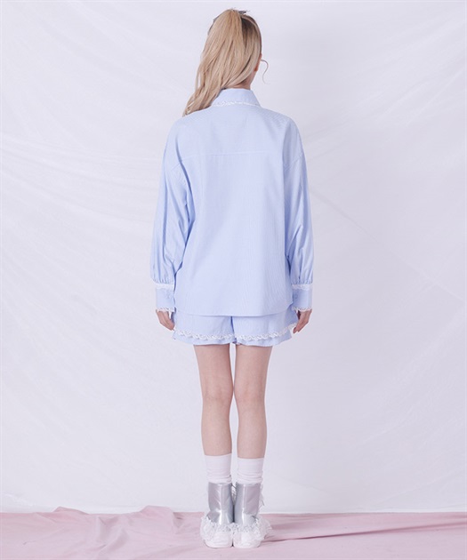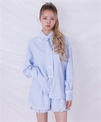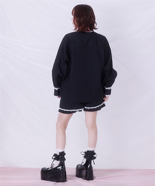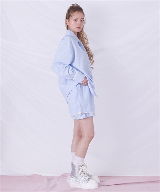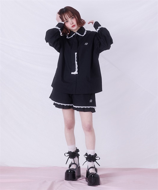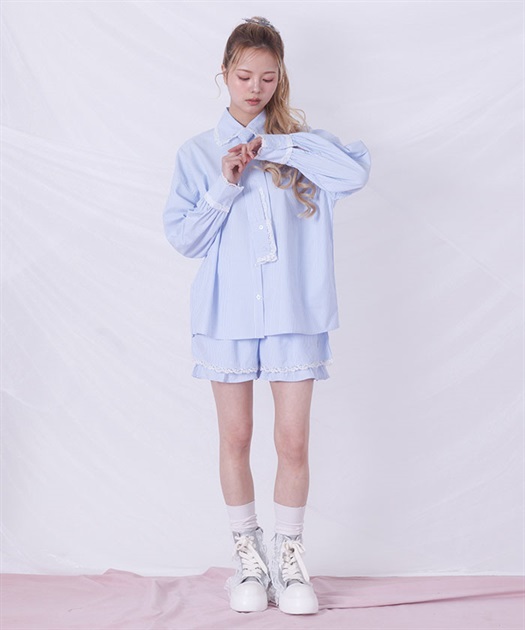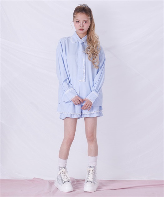 メンズライクなシャツデザインにレースフリルをあしらったセットアップ。