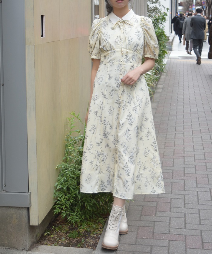 フラワー柄ハイウエストワンピース