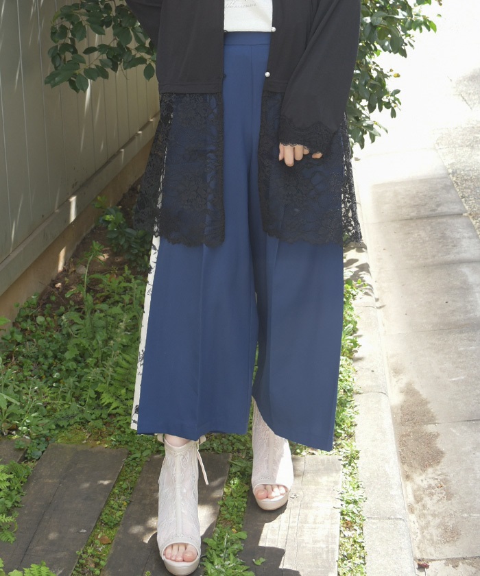 サイド花柄切替ワイドパンツ