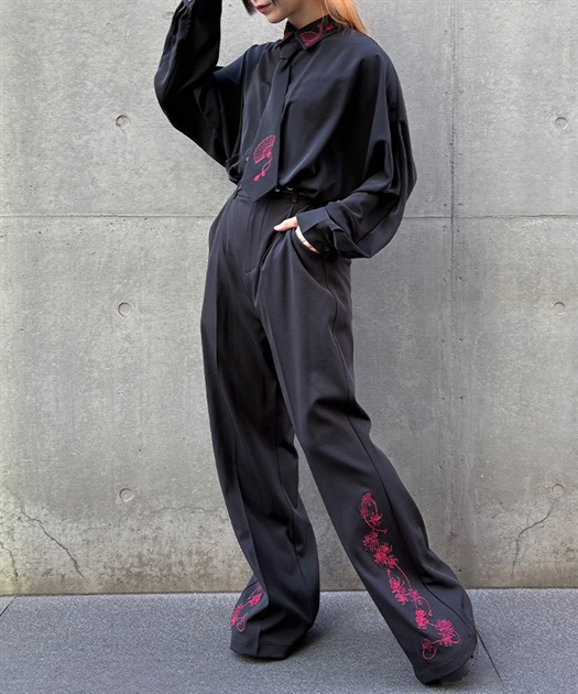 扇子の刺繍が和モードな雰囲気を醸し出すシャツ。