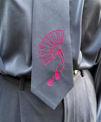 襟とネクタイに施された扇子とタッセル紐の刺繍が、雅なテイストに。