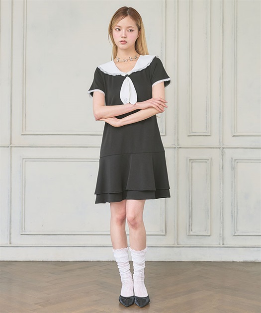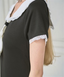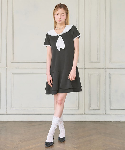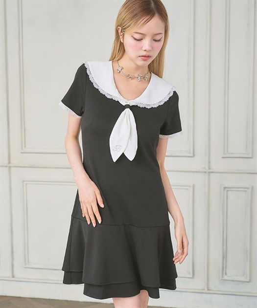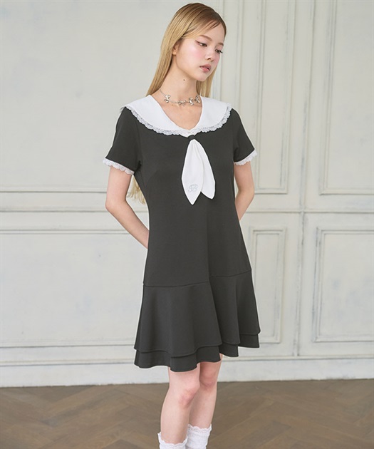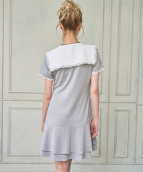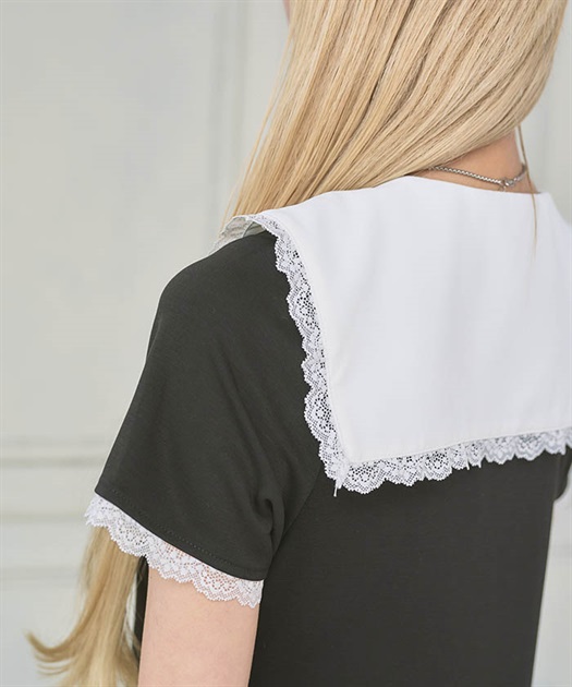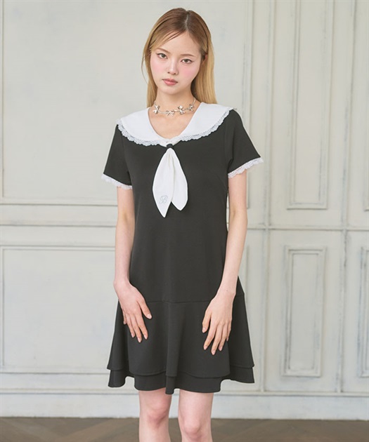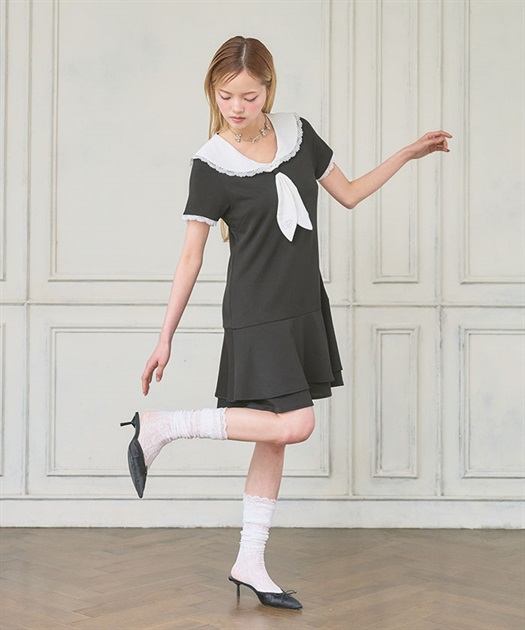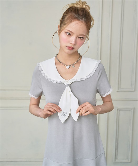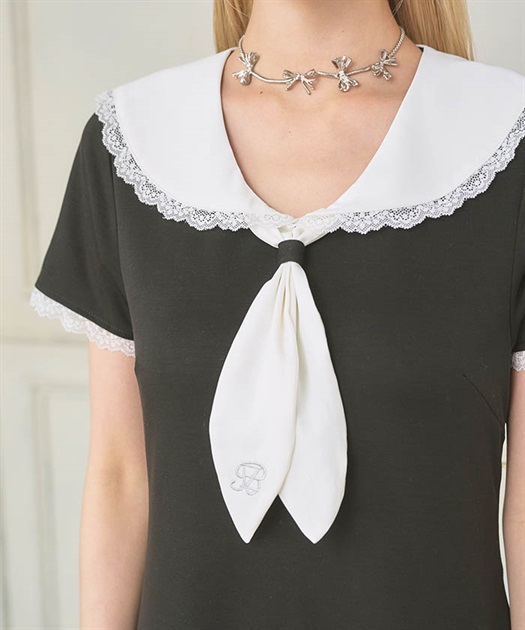 なめらかな艶のある生地に繊細なレースをあしらった、セーラーカラーと揺れるリボンタイがインパクトのあるデザイン。