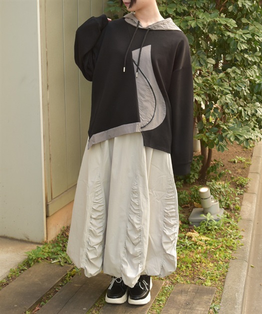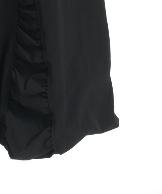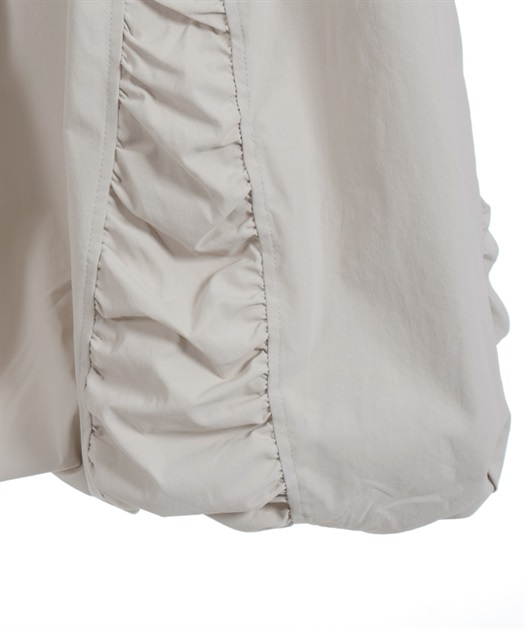 丸みのあるシルエットがやさしく広がり、動くたびにふわっと揺れて存在感を演出します。ウエストはすっきり見える仕様で、ボリュームがありながらも上品にまとまる一着です。