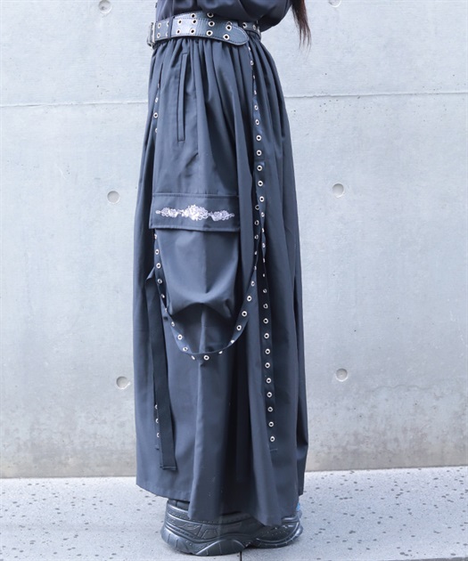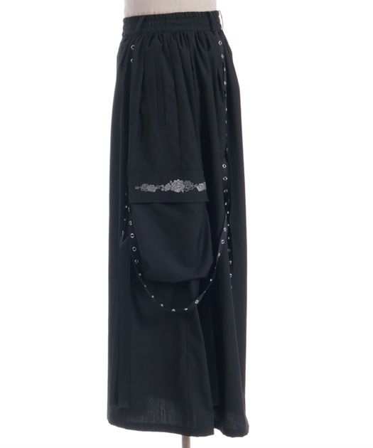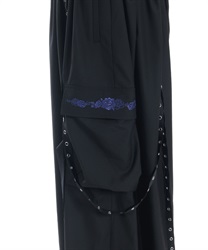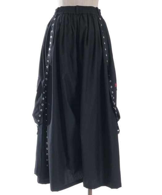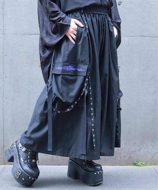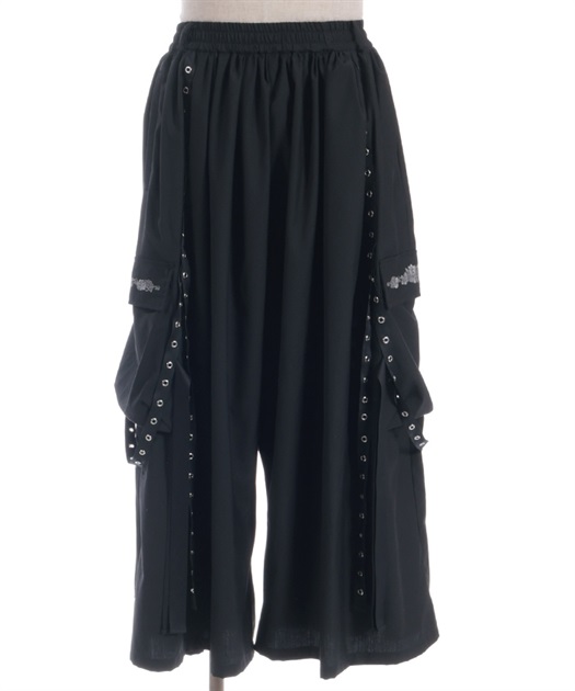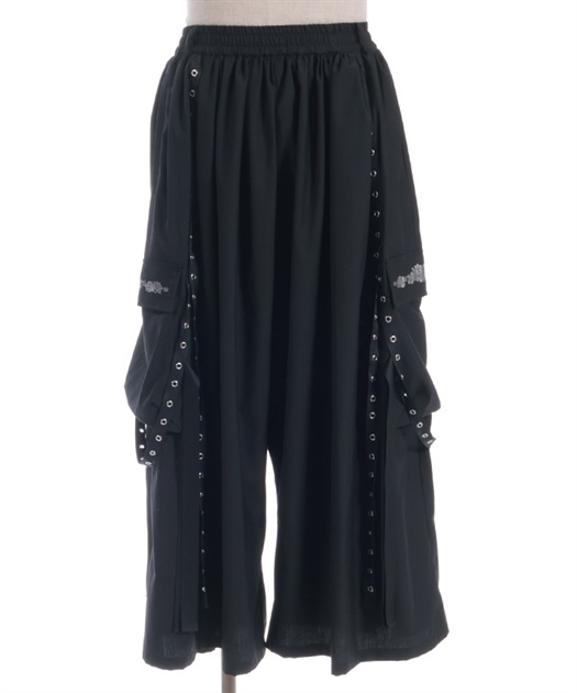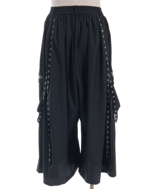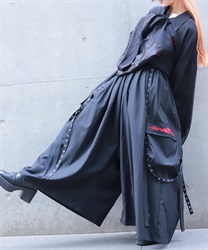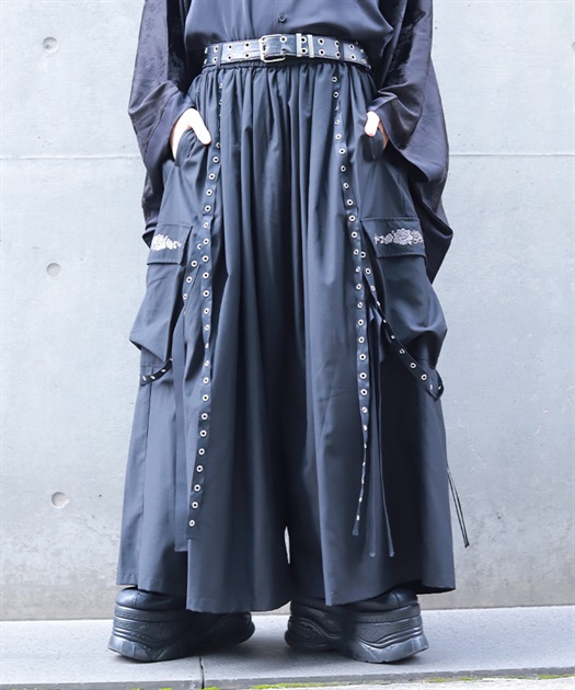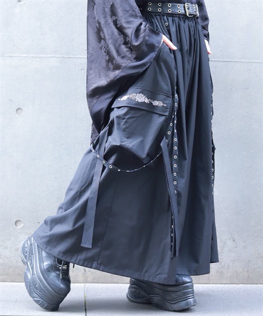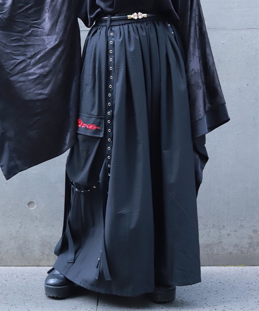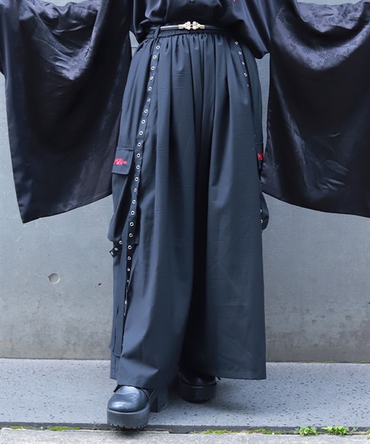 伝統的な袴のシルエットにカーゴパンツポケットやコード、ハトメ付のテープを配置することで、和洋折衷なデザインに。