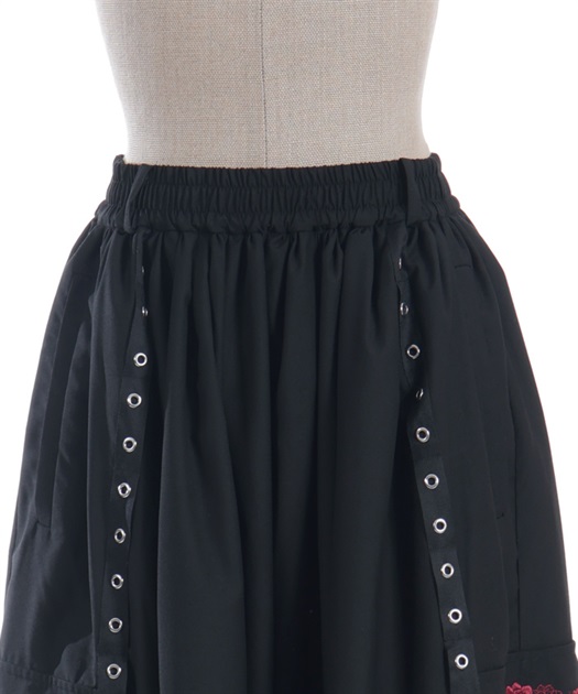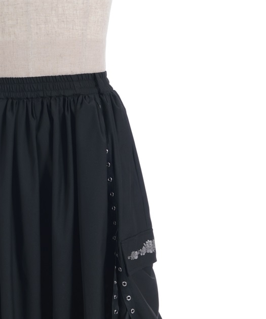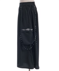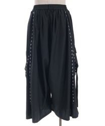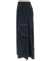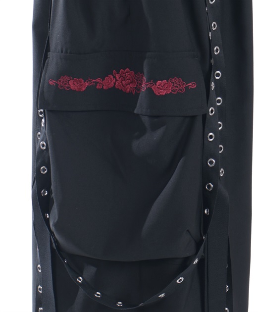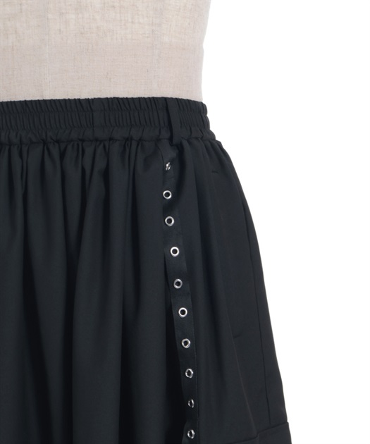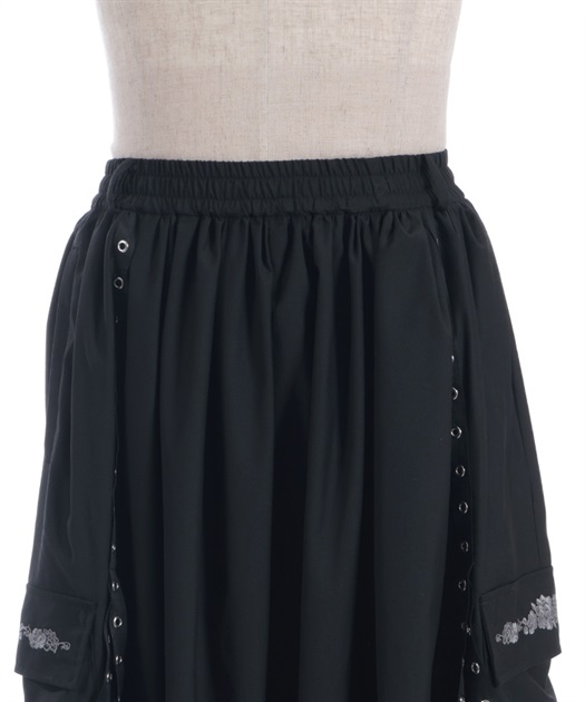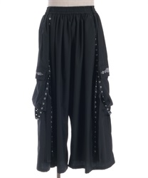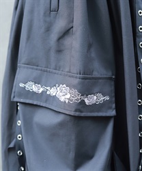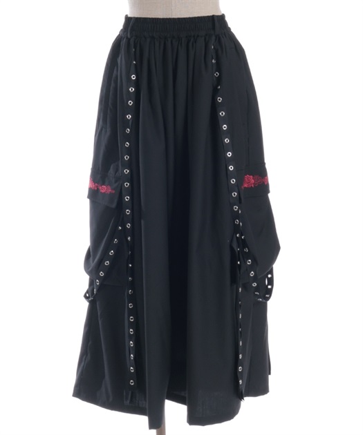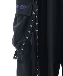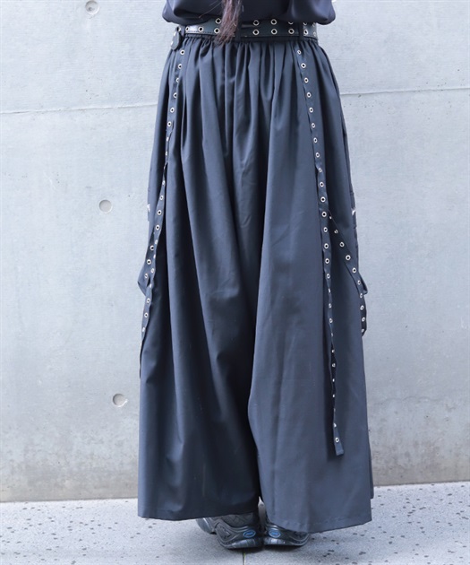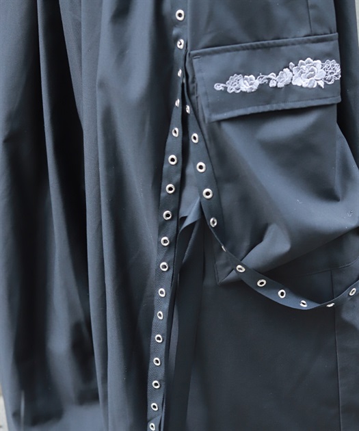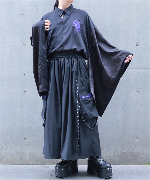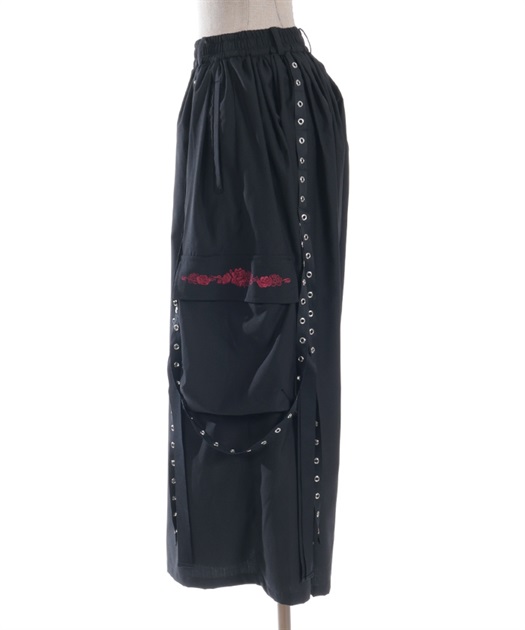 伝統的な袴のシルエットにカーゴパンツポケットやコード、ハトメ付のテープを配置することで、和洋折衷なデザインに。