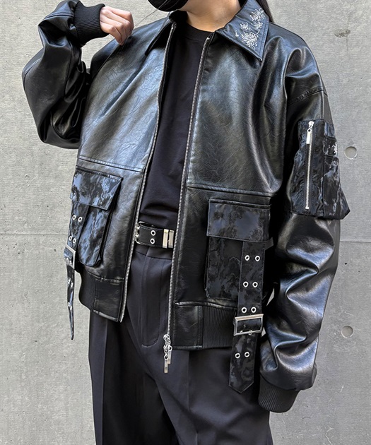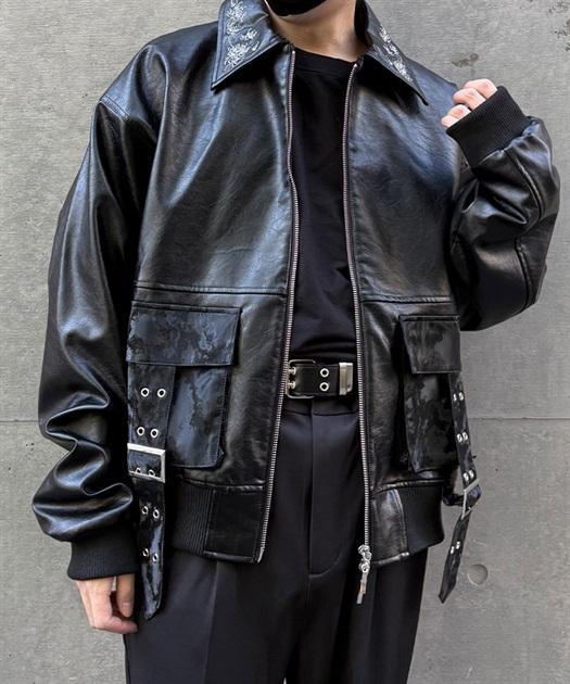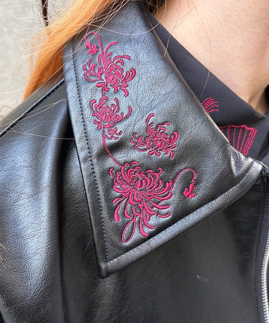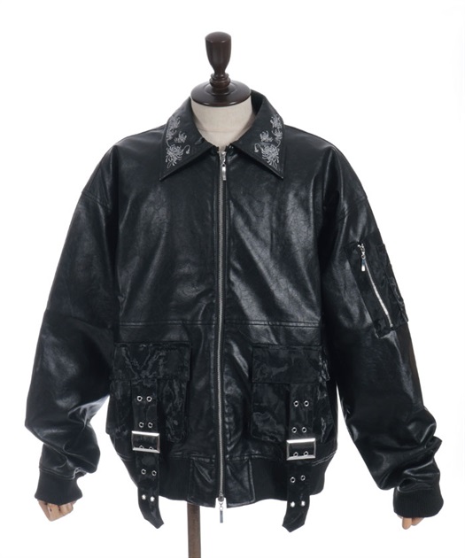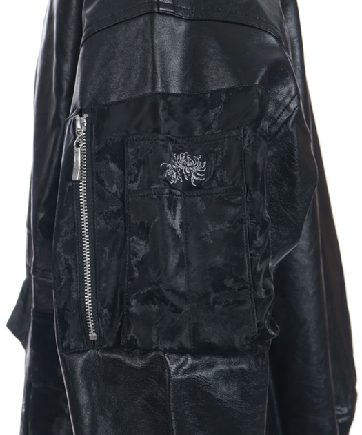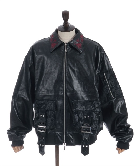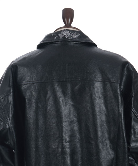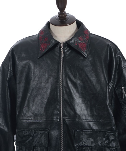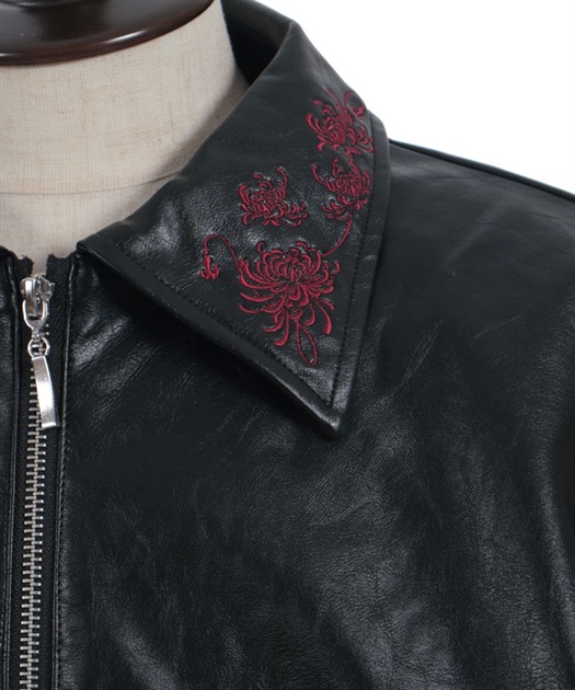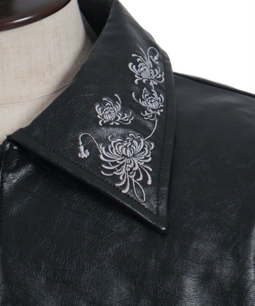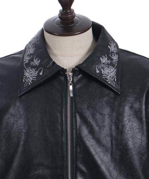 合皮の質感と刺繍の組み合わせが、和洋折衷な雰囲気を醸し出すブルゾン。