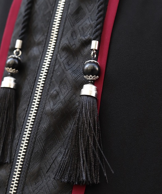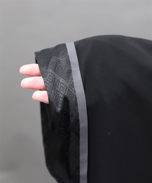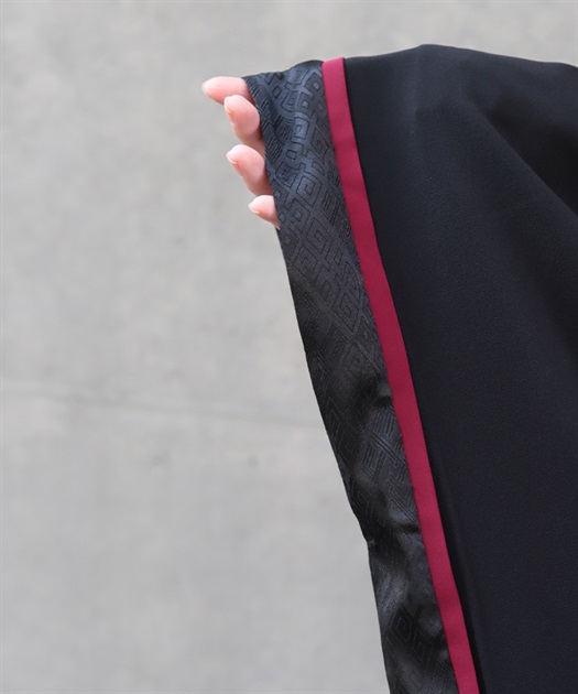 袖先や衿に施したパイピングの配色と和柄のジャガード生地が、雅なアクセントに。