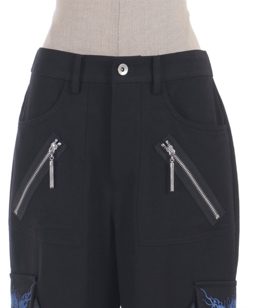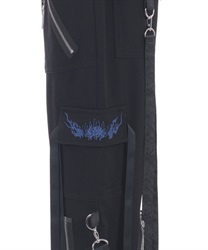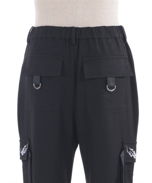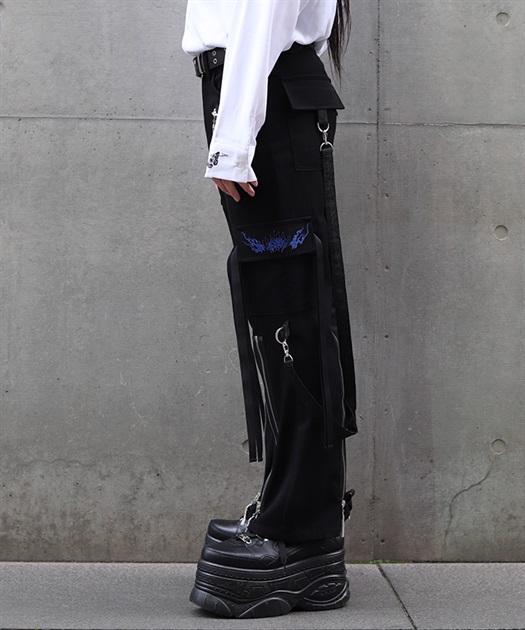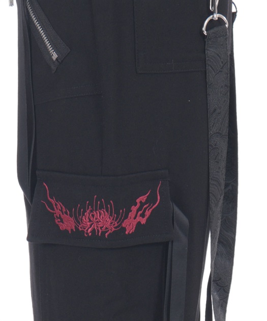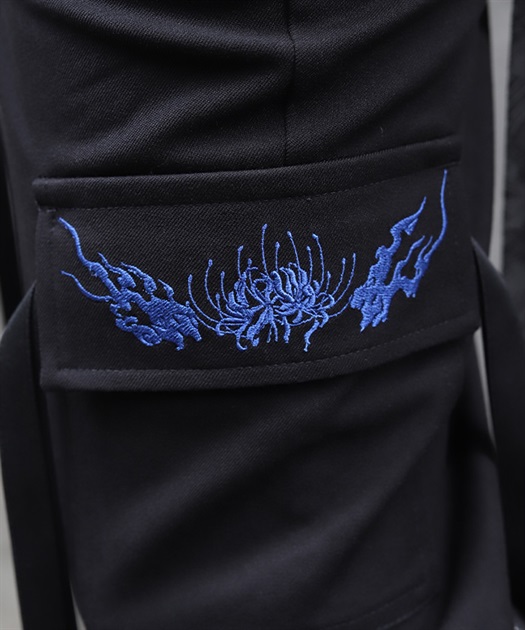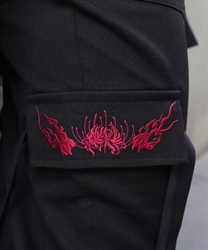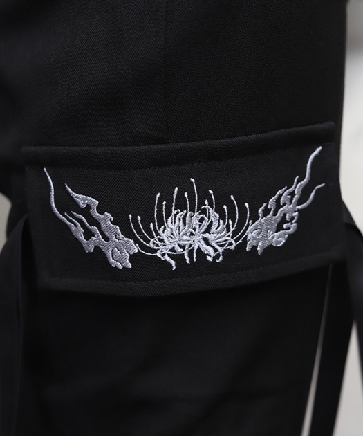 カーゴポケットは、フラップに彼岸花と鬼火の刺繍を、両端には二重のストラップを配置。