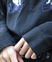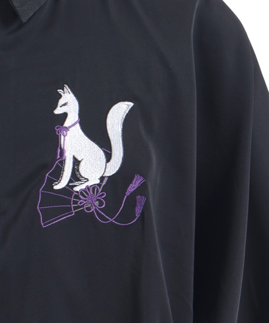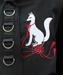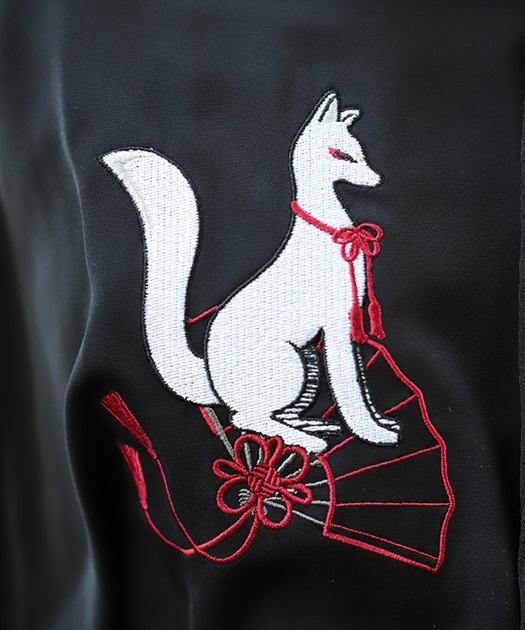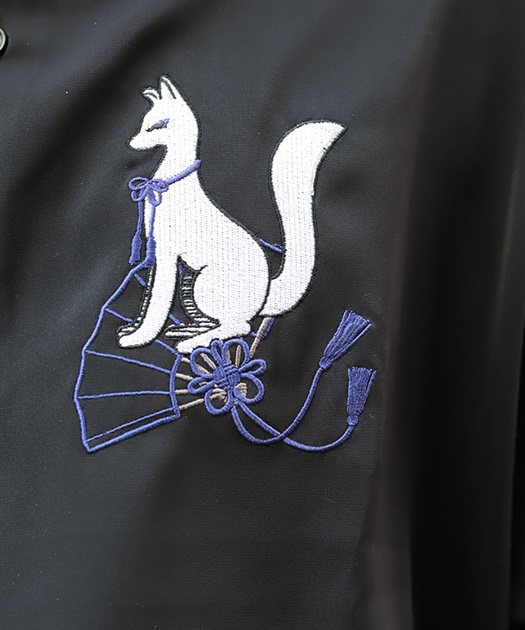 狐の目元の化粧やラメ糸で表現した毛の質感など、ディテールにこだわった刺繍が圧倒的な存在感を放ちます。