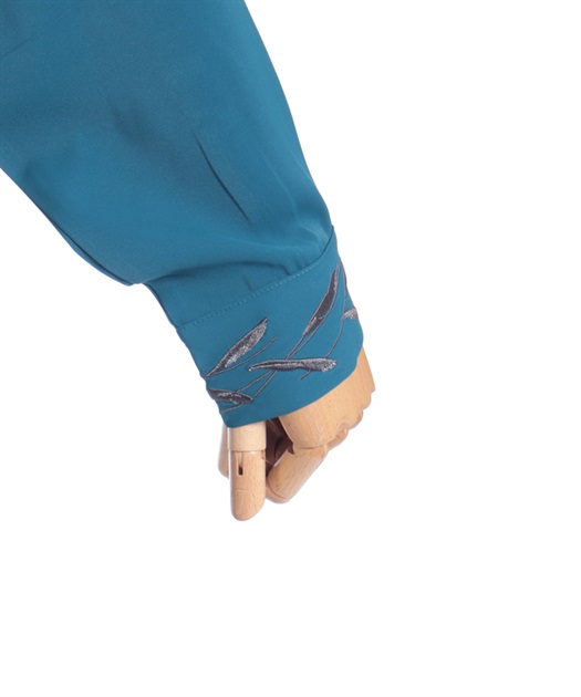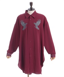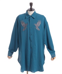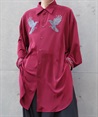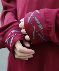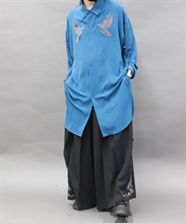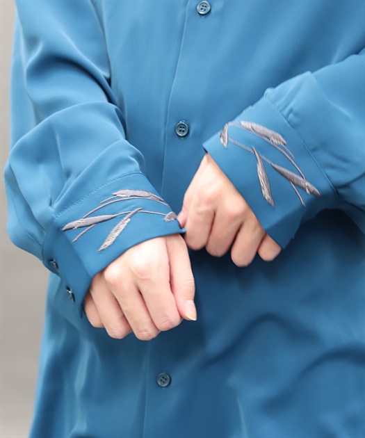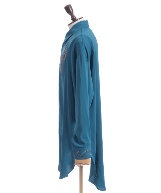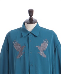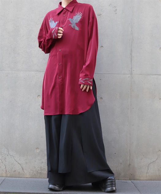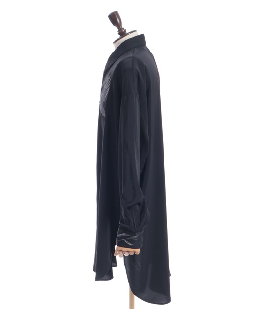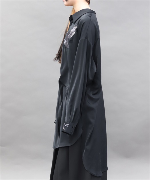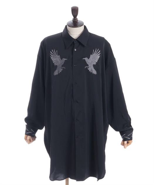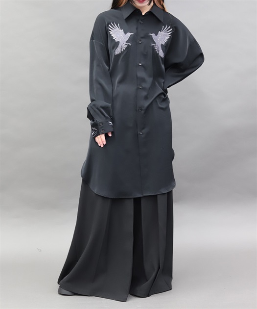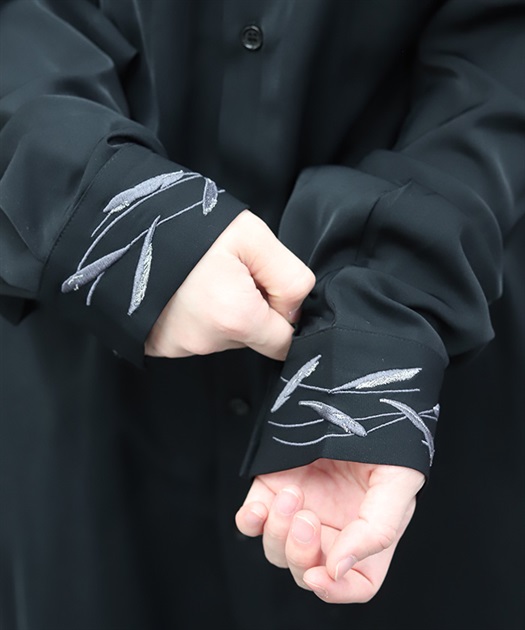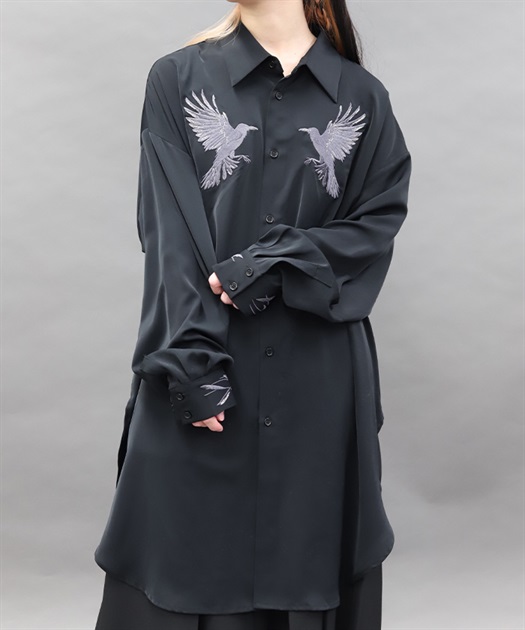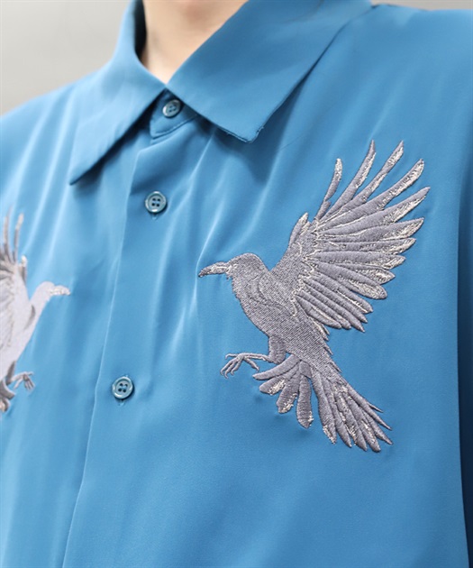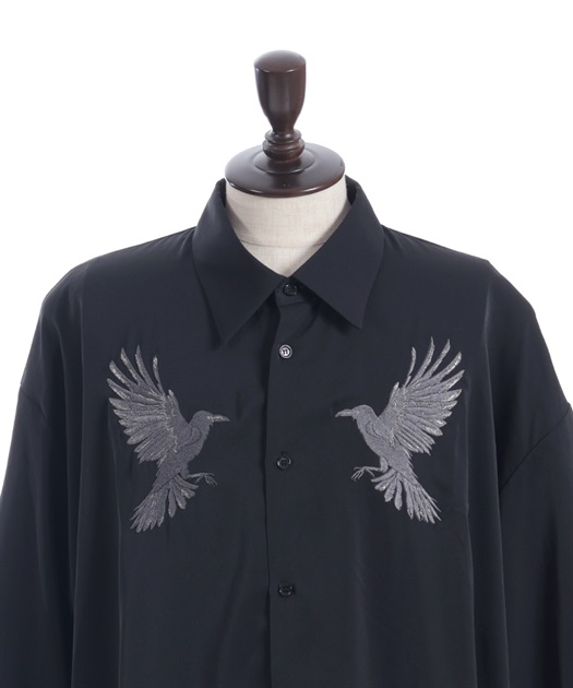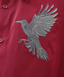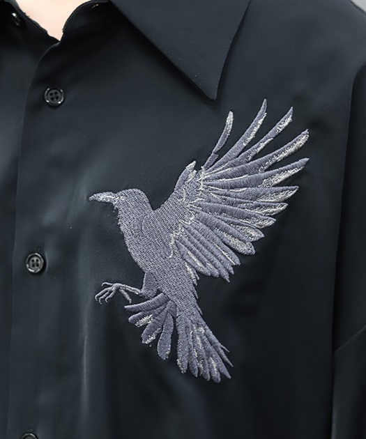 胸元には鴉の羽ばたく様を、複数色の刺繍糸を用いて立体的に表現。