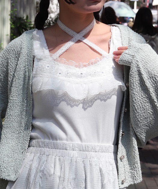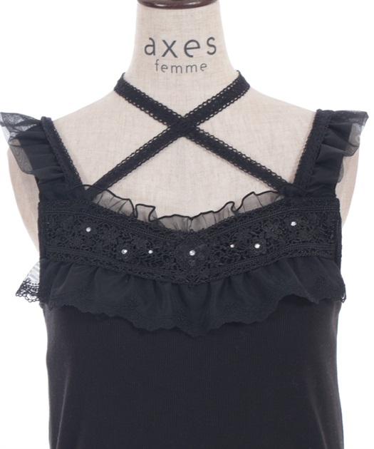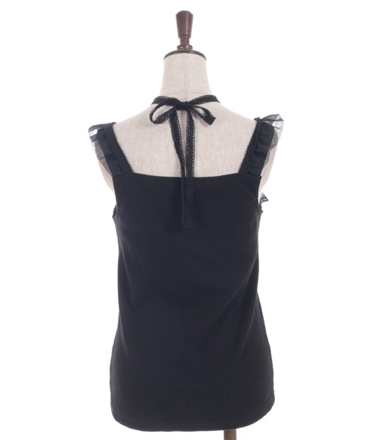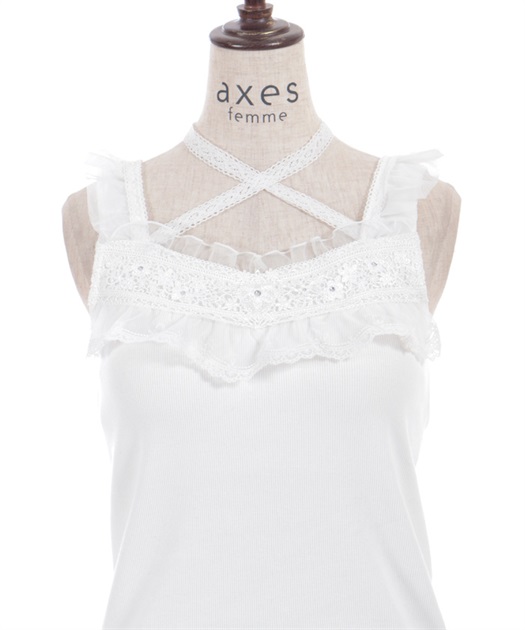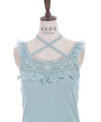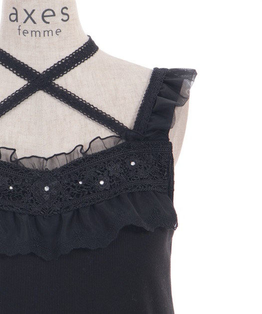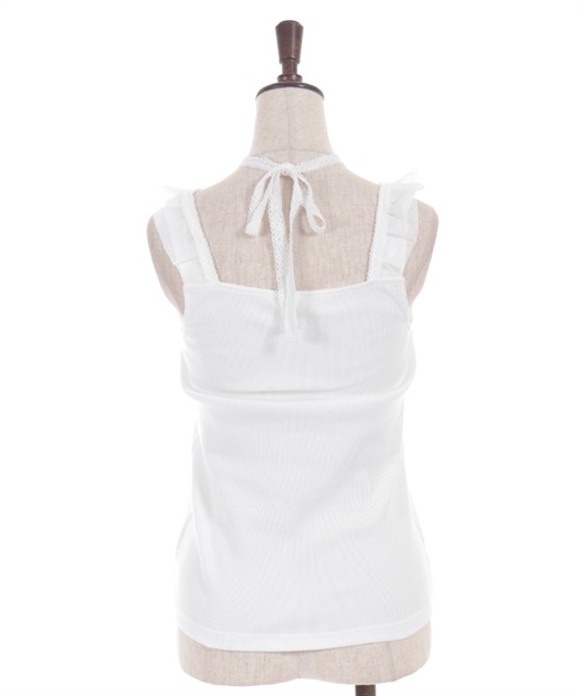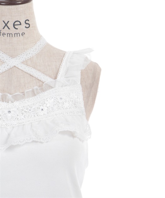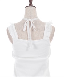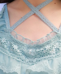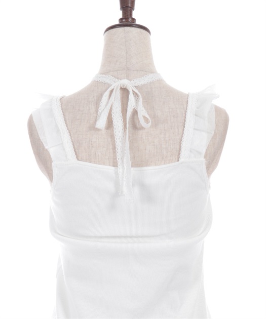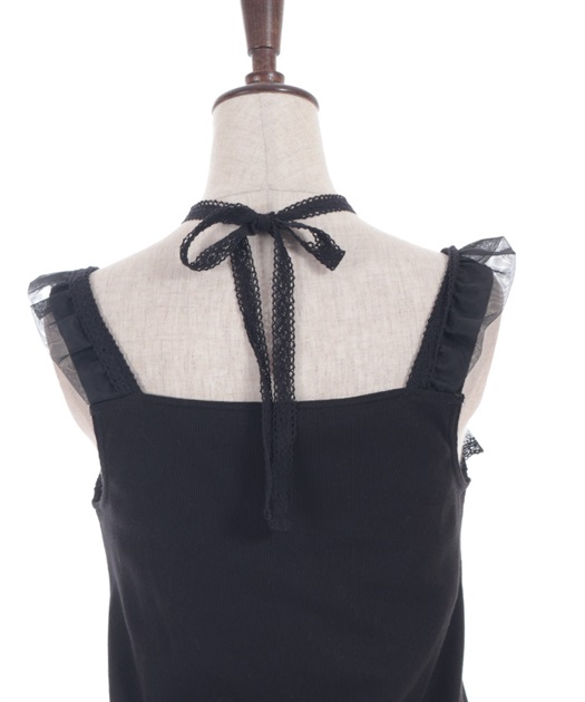 肩紐の細部までチュールフリルがあしらわれているため、見せるアウトタンクとしても。