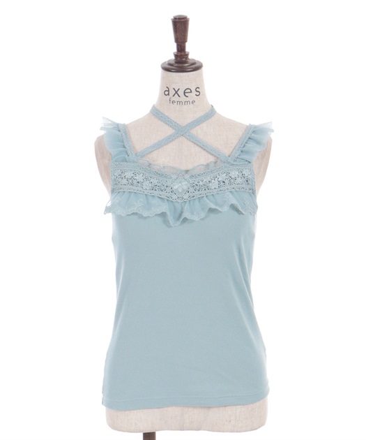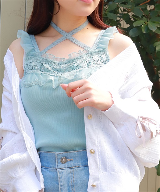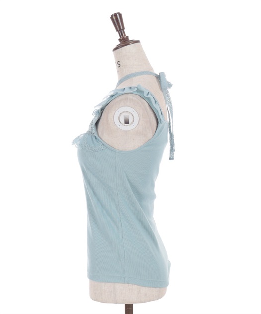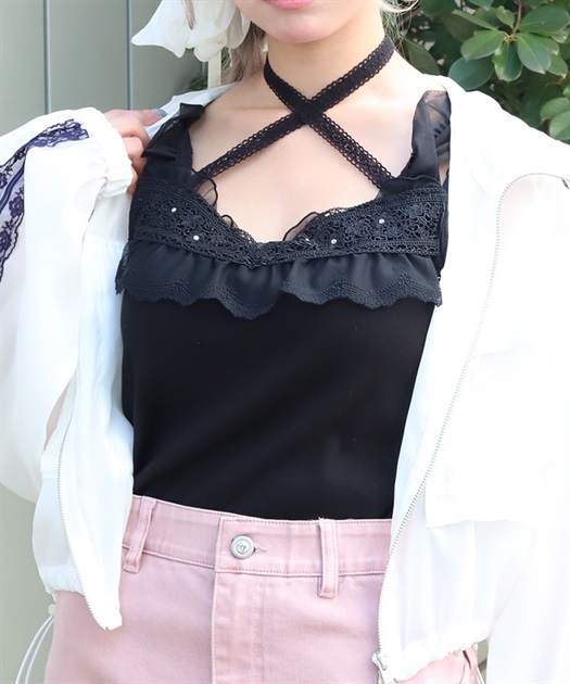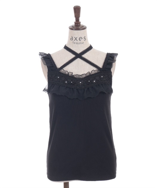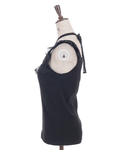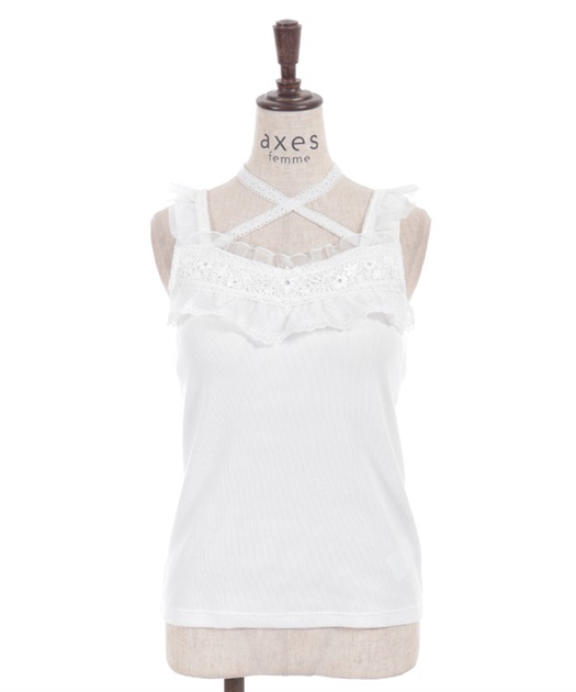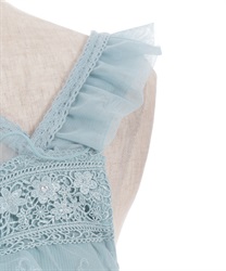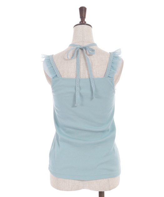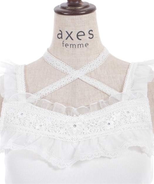 肩紐の細部までチュールフリルがあしらわれているため、見せるアウトタンクとしても。