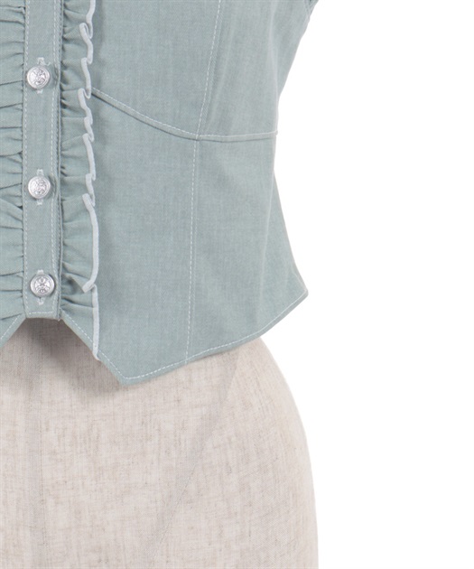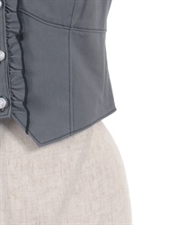 コンパクトなシルエットにフリルをあしらい、やさしい華やかさを添えたデザイン。フロントのボタンディテールや立体的なラインが全体を引き締め、スタイリングにメリハリをプラスします。簡単にレイヤードスタイルが完成し、奥行きのある表情を生み出し活躍する一着です。