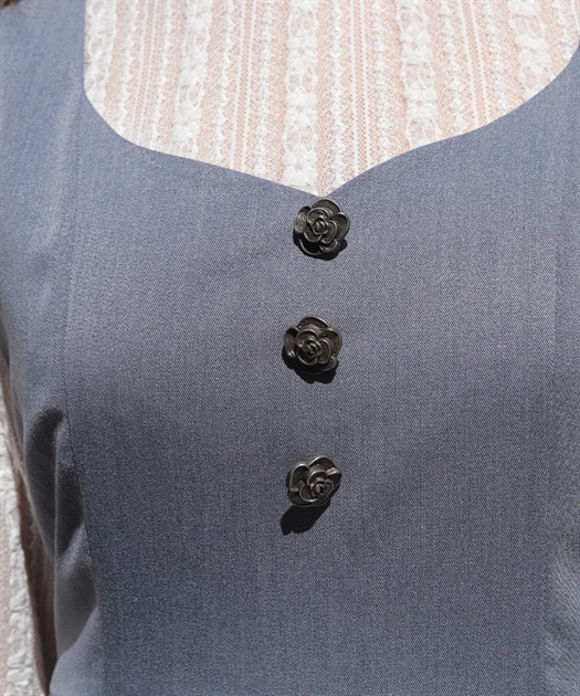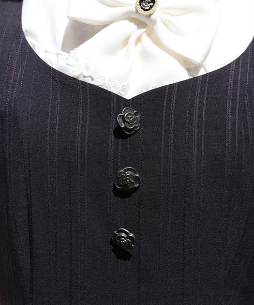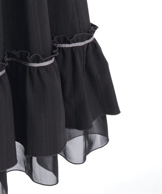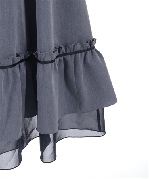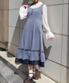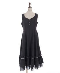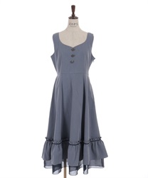 ウエスト切替からふんわりと広がるラインが、軽やかで女性らしい印象を演出する一着。フロントのボタンディテールがさりげないアクセントになり、シンプルながらも表情のあるデザインに仕上げています。裾にはフリルをあしらい、動きに合わせてやさしく揺れるのもポイントです。