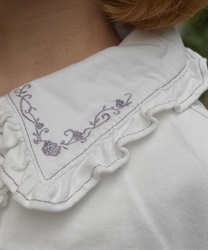 襟を縁取るようなローズのアンティーク風刺繍が華やかです。