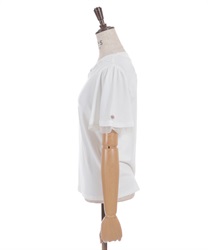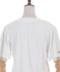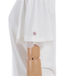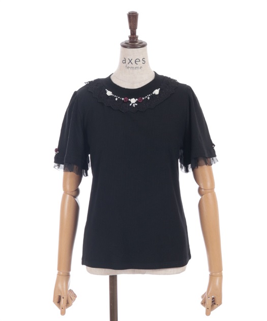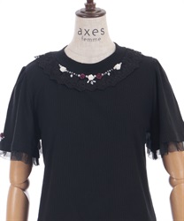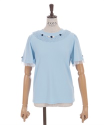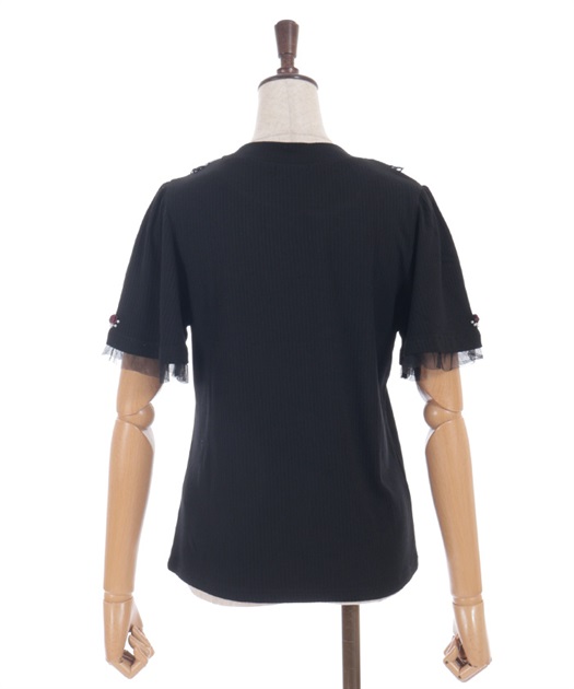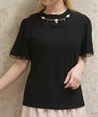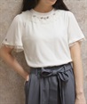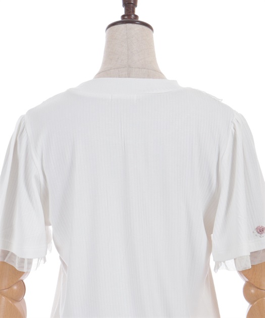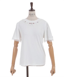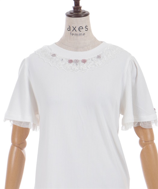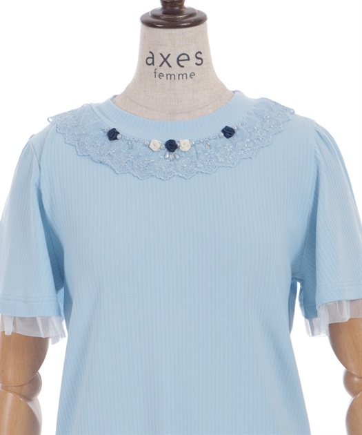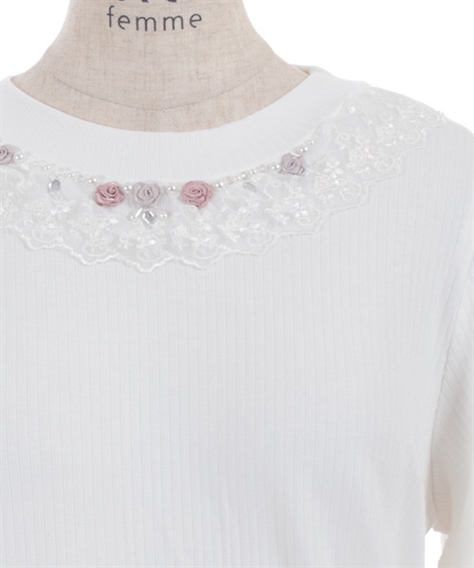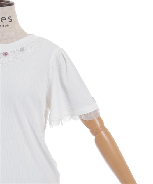 サテンリボンで作られた巻きバラが胸元を上品に彩る半袖トップスです。