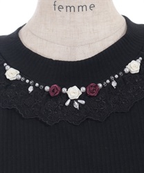 巻きバラ・パール・ビーズをネックレスのように襟ぐりに施した装飾性の高いデザイン。