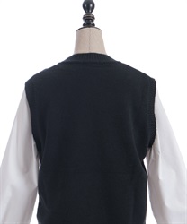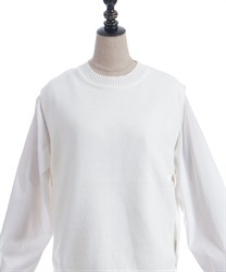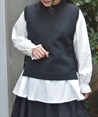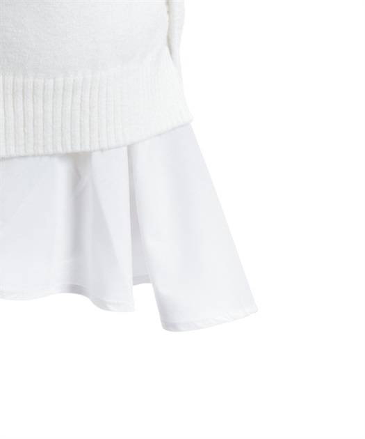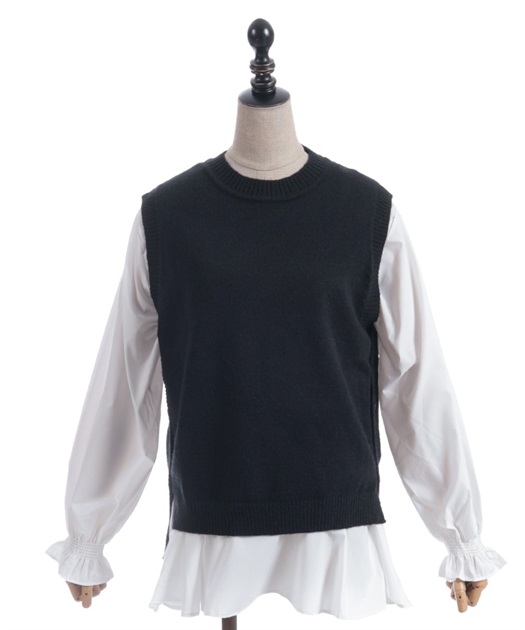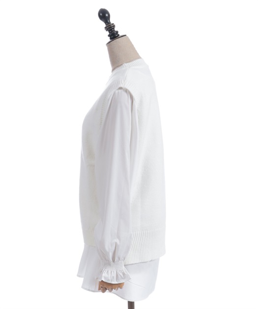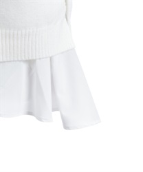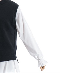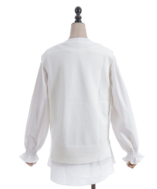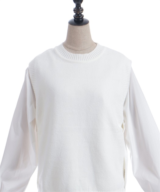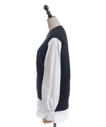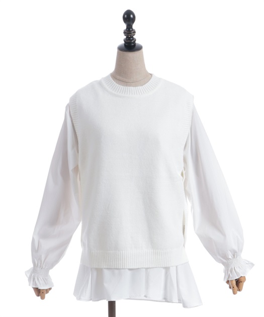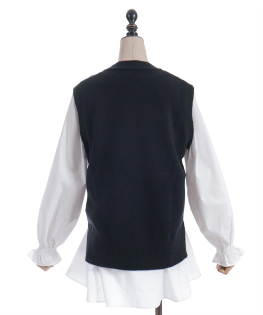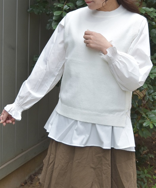 ニットベストとシャツをレイヤードしたようなドッキングデザインのトップス。