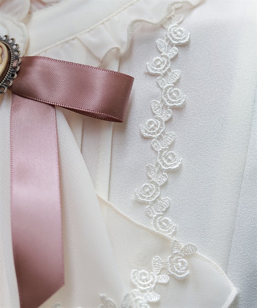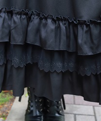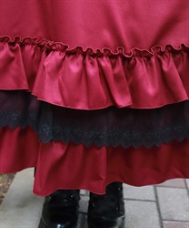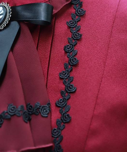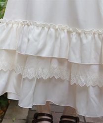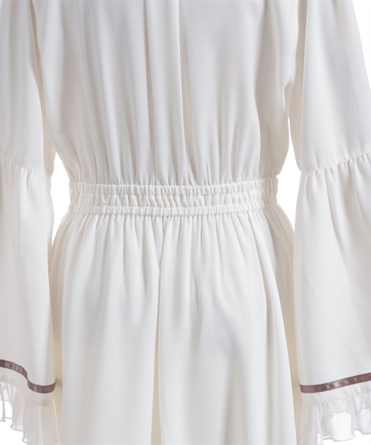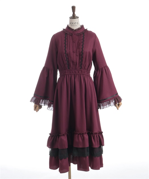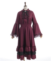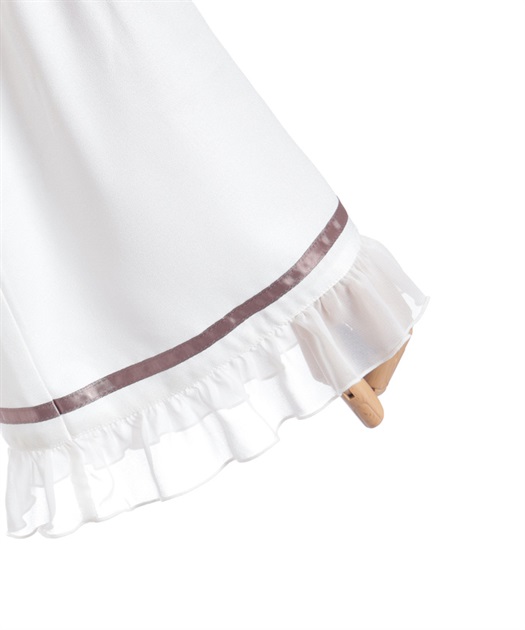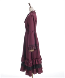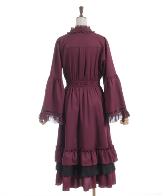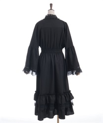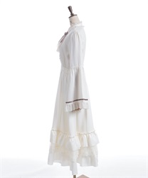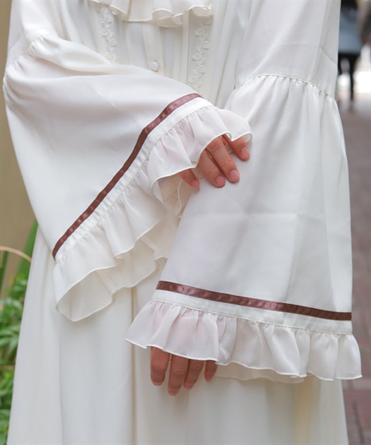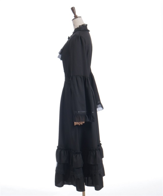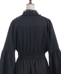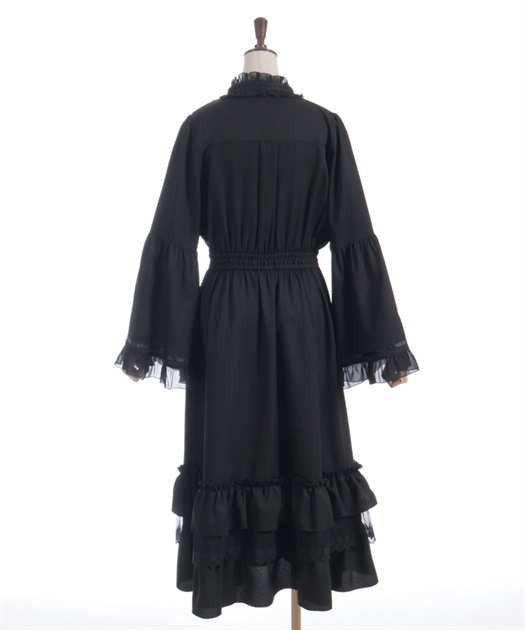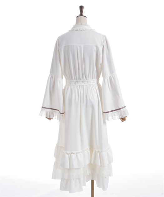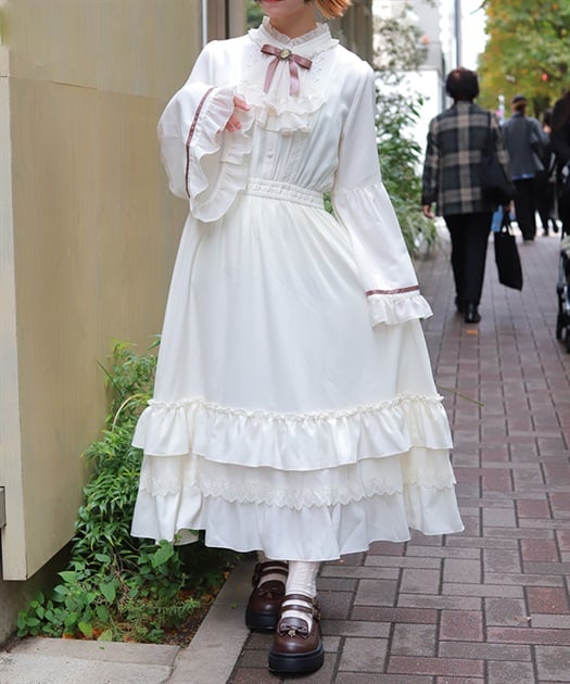 袖口や裾のフリル切り替えが動くたびに揺れ、クラシカルなシルエットを際立たせます。