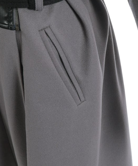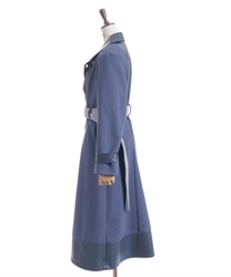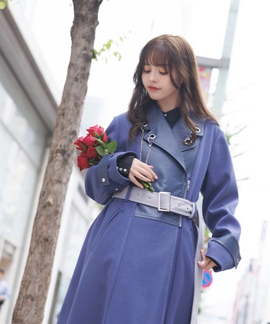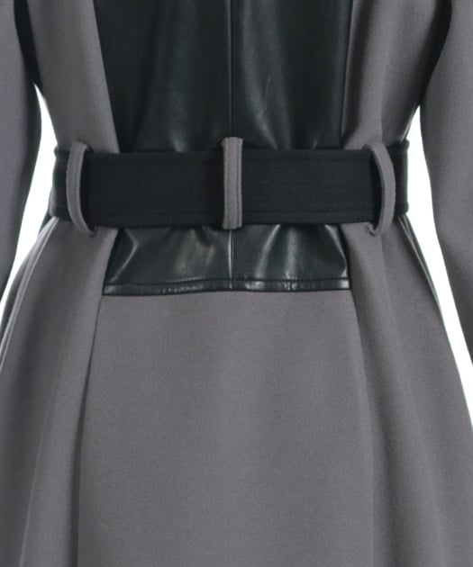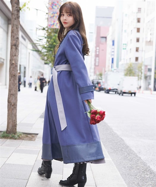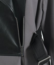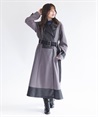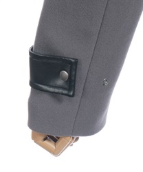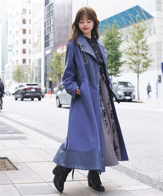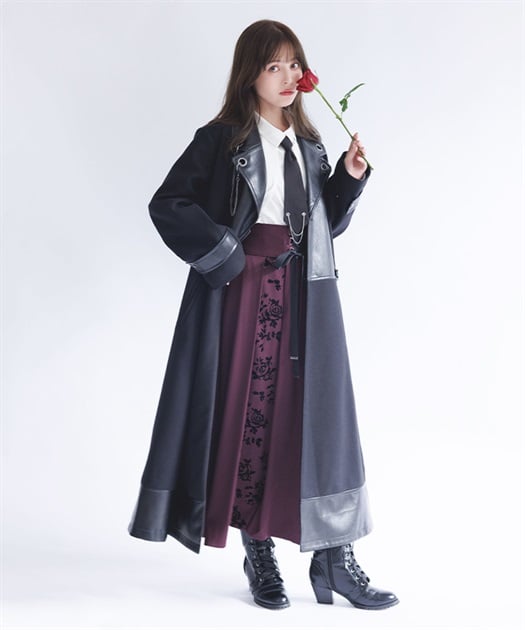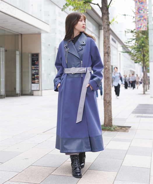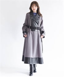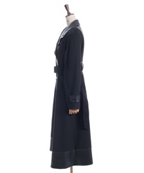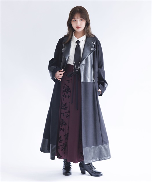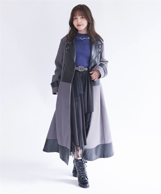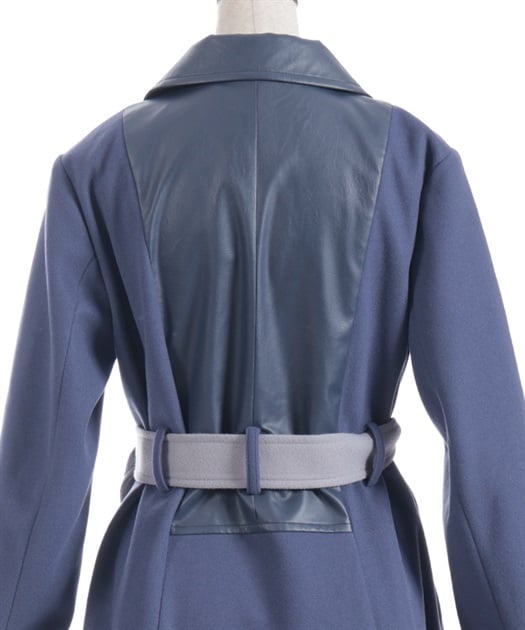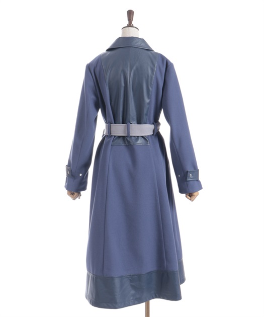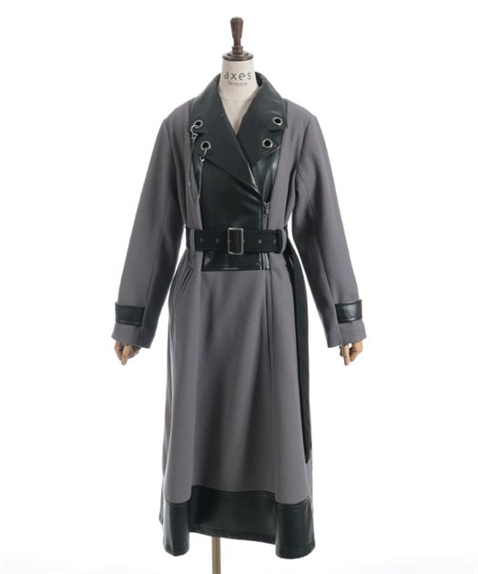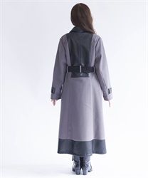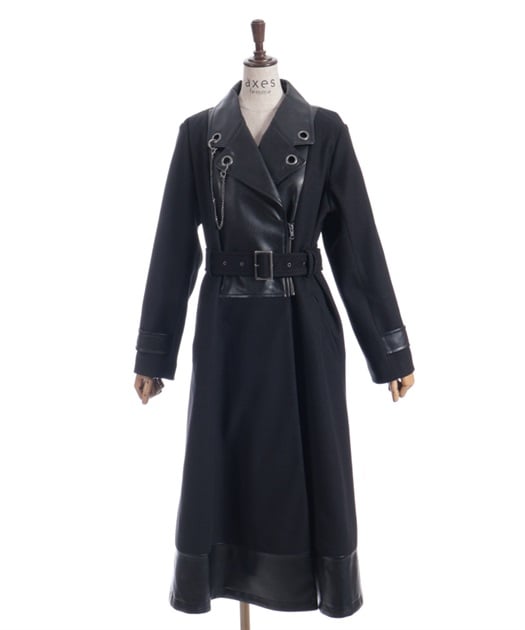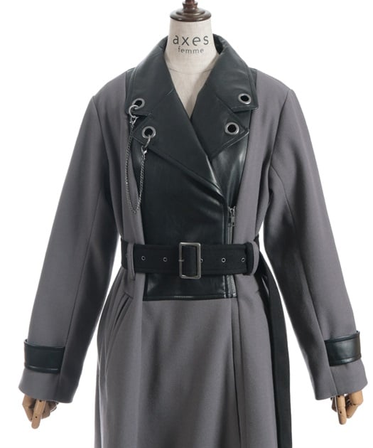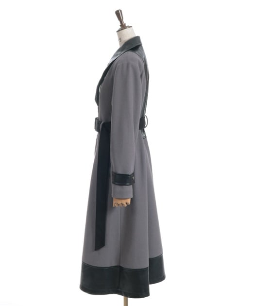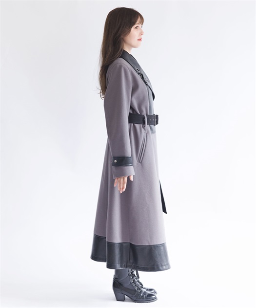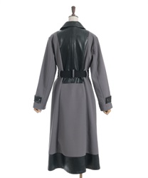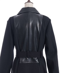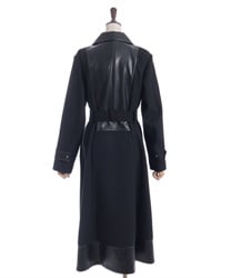 フェイクレザーと異素材の切替がスタイリッシュな印象を与えるロングコート。上品さの中にモードな要素を取り入れ、クールな雰囲気を演出します。