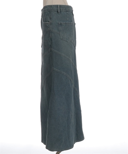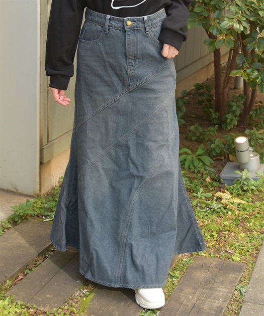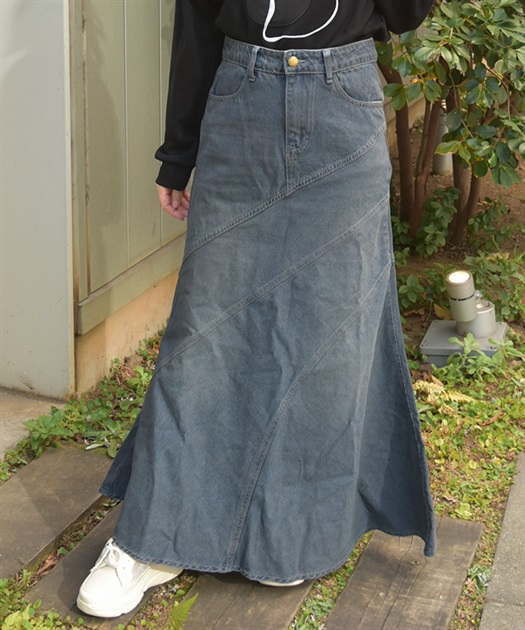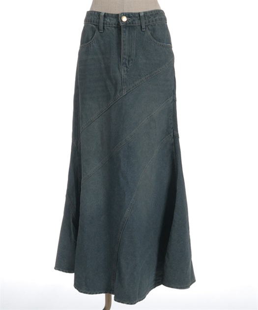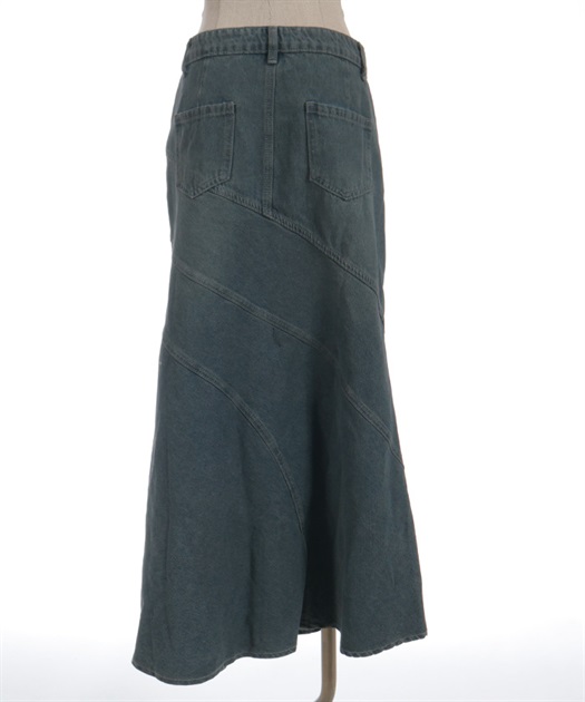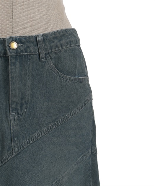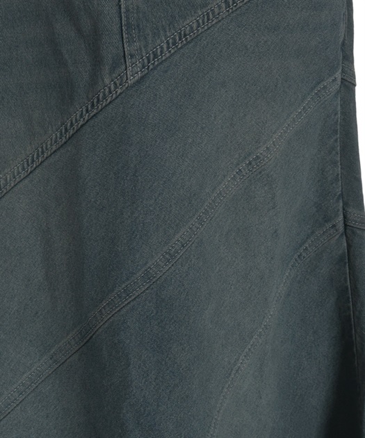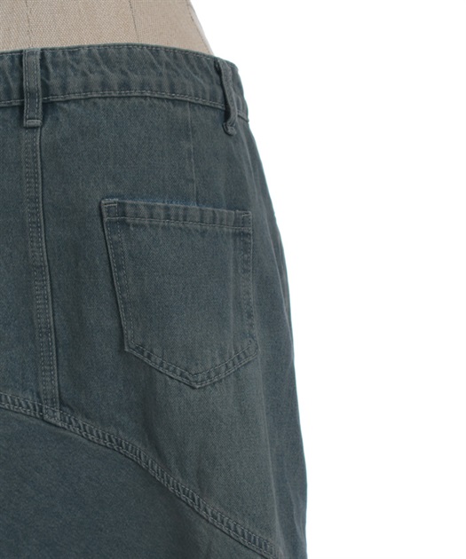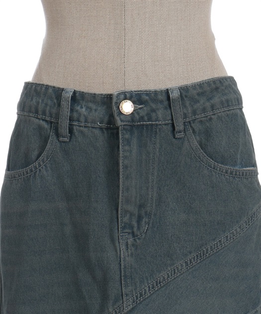 デニム素材でデイリーに取り入れやすく、斜め切替のシルエットが目を引くデニムエスカルゴスカート。