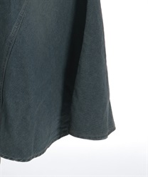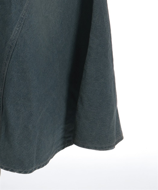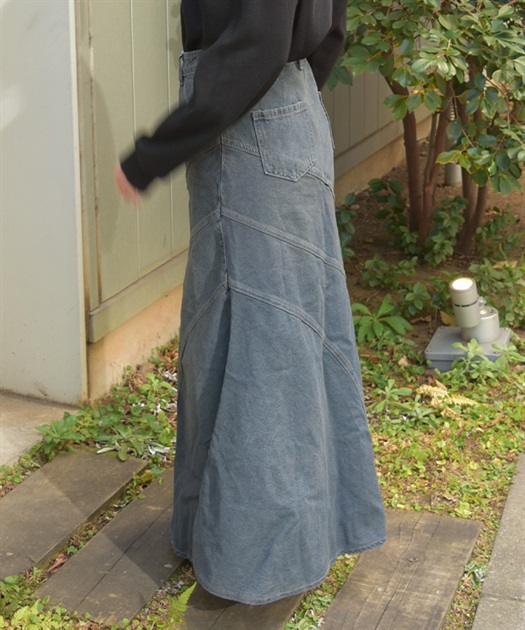 エスカルゴラインの切替が自然な立体感を生み、歩くたびに裾が揺れて女性らしい印象に仕上がります。デニムならではの程よいカジュアル感がありつつ、広がりすぎないラインで大人っぽくまとまる一着です。