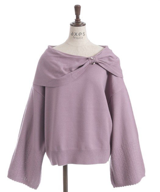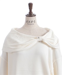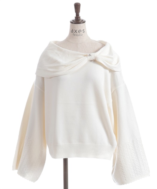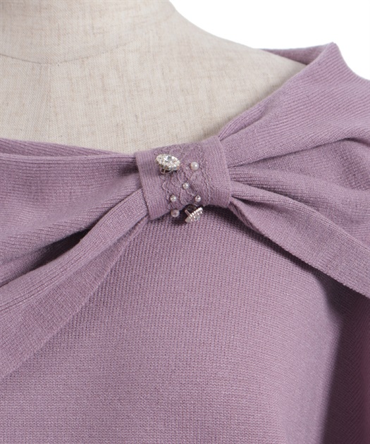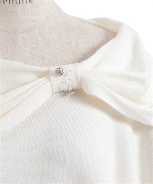 ドレープの効いたリボンをデコルテラインにあしらった、オフタートルのニット