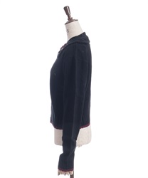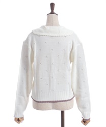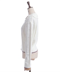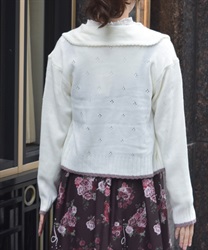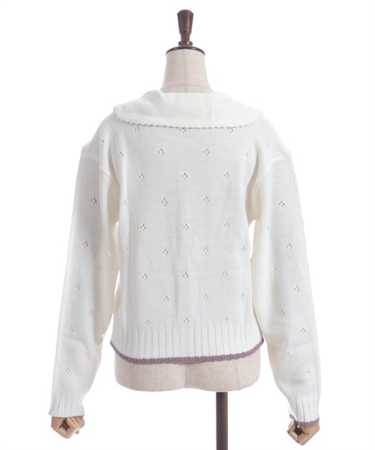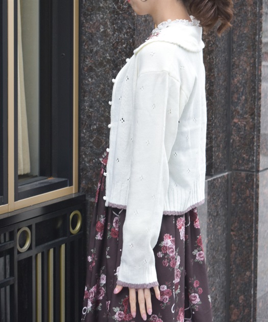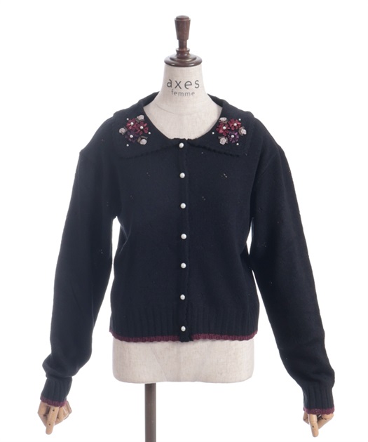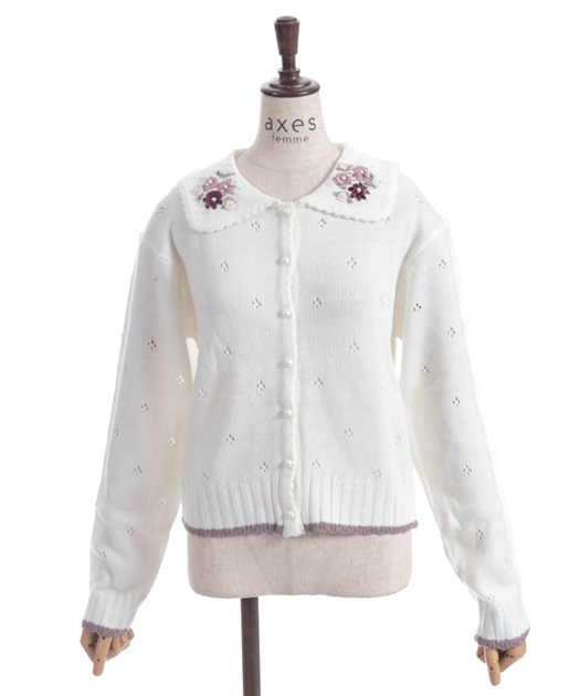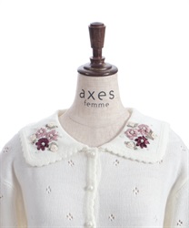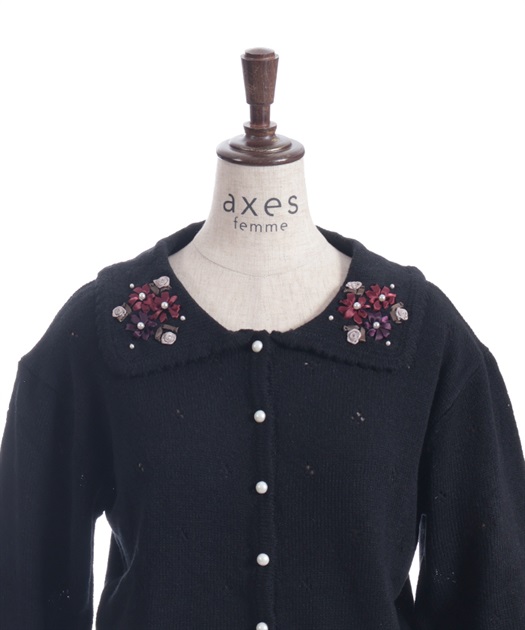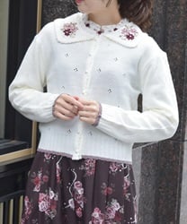 リボン刺繍フラワー×サテン巻きバラを華やかに施した襟がポイントのニットカーディガンです。