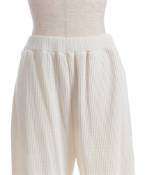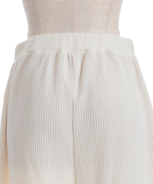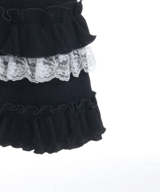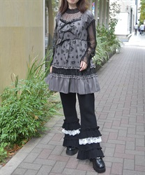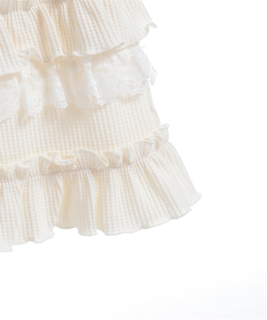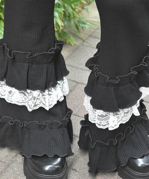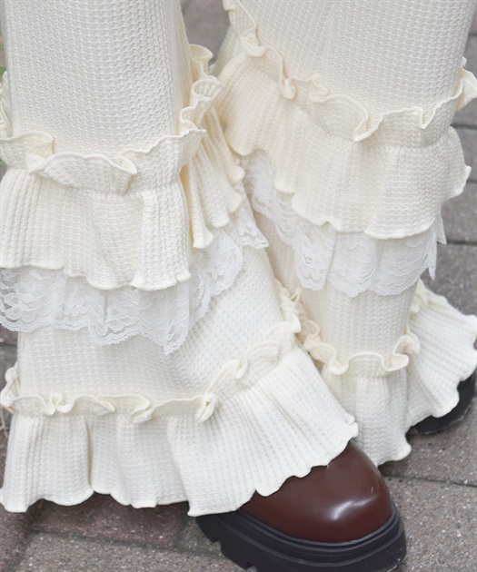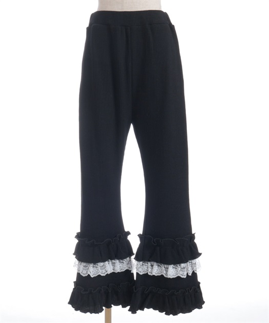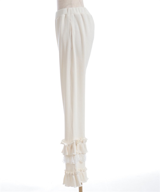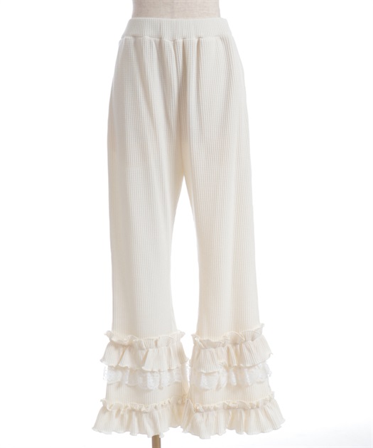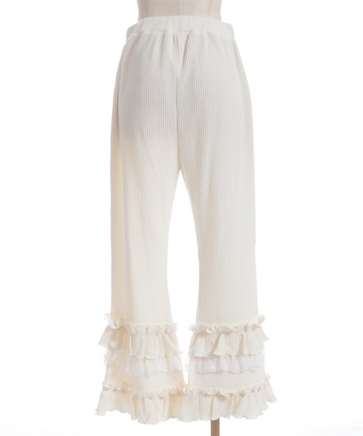 裾にたっぷりとあしらわれたフリルとレースがポイント。ボリュームのあるデザインながら、脚のラインをきれいに見せてくれるシルエットに仕上げています。ウエストはゴム仕様で、快適なフィット感を実現。