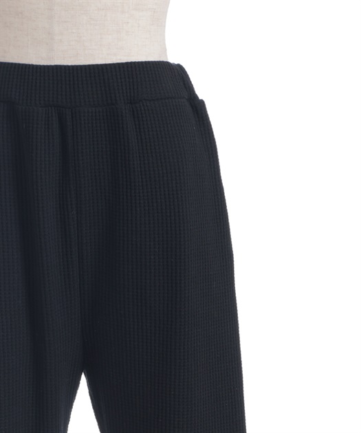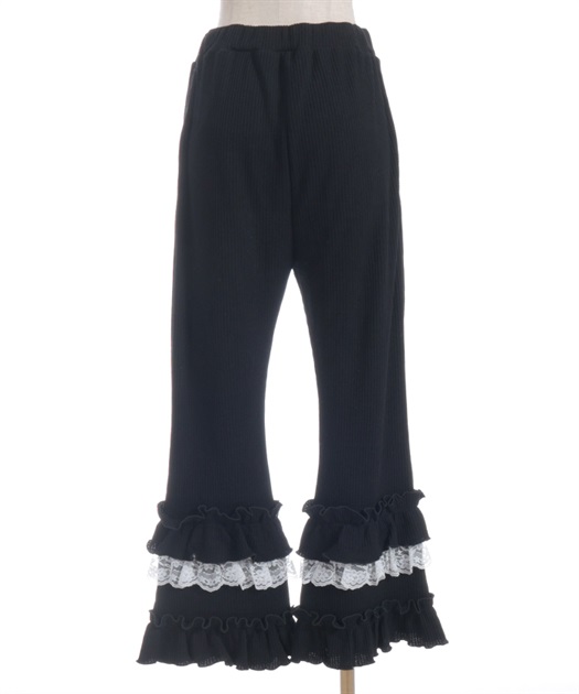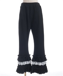 柔らかく伸びのあるカットソー素材で、ストレスフリーな履き心地のフリルパンツ。動くたびに揺れる裾のフリルとレースが、ガーリーな印象をプラスします。シンプルなトップスに合わせてもフェミニンなムードをプラスできるアイテムです。