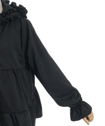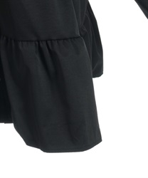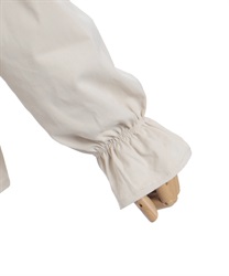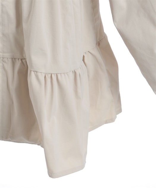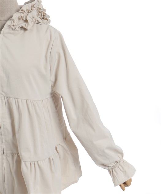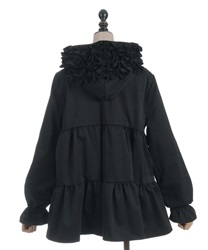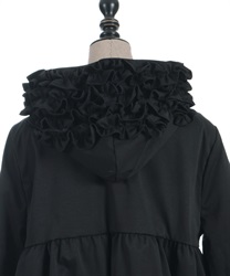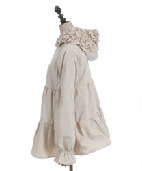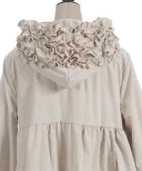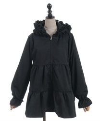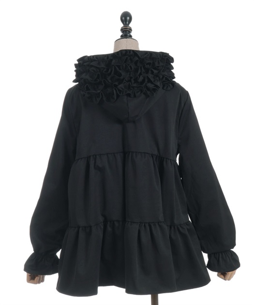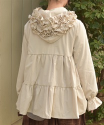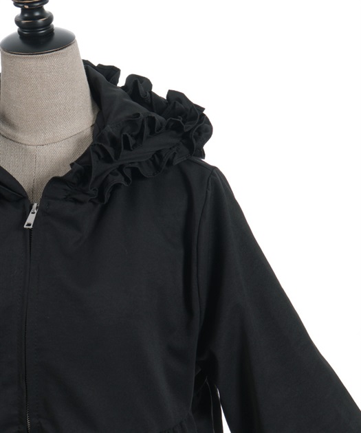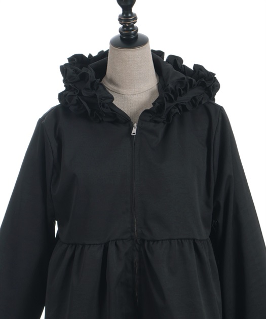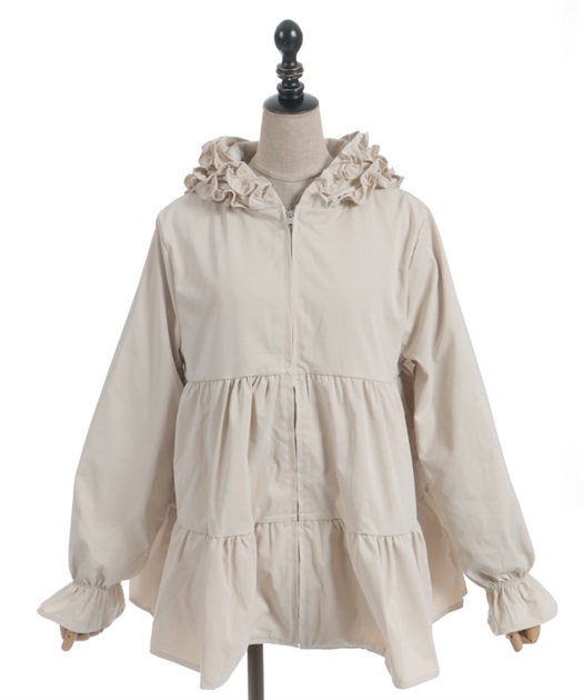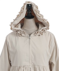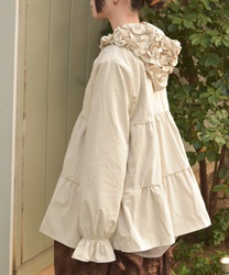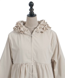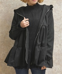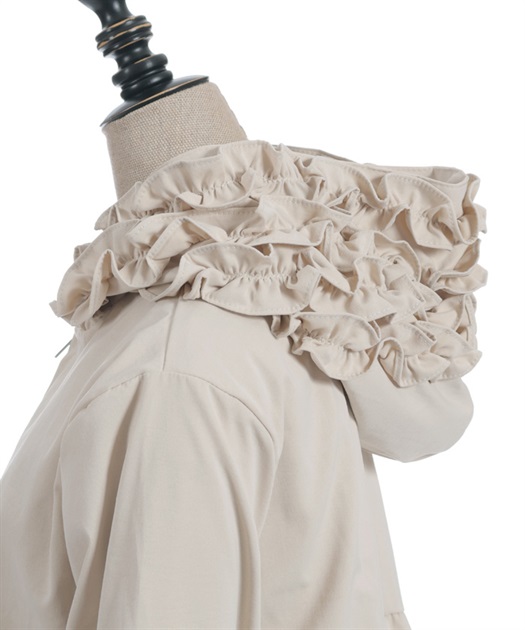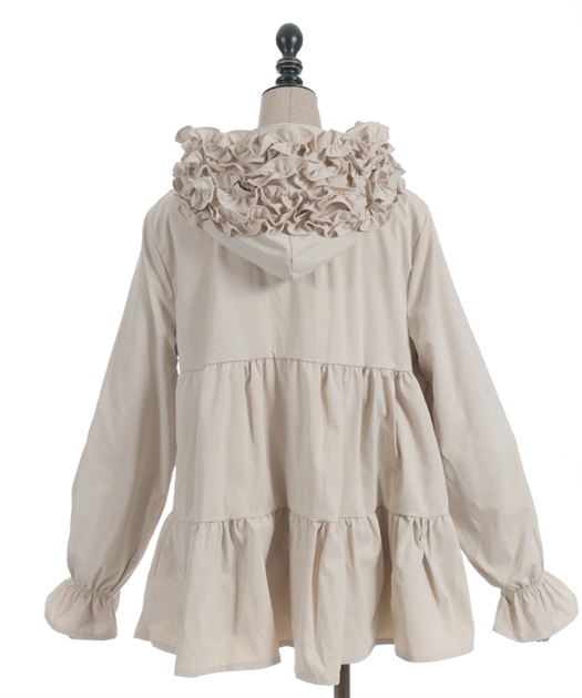 軽やかな素材感でさっと羽織りやすく、切替えのギャザーが動くたびにやさしい立体感を演出します。フード付きのデザインが程よくカジュアルさを添え、甘さとラフさを両立した一着です。