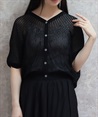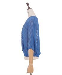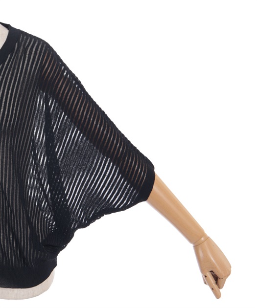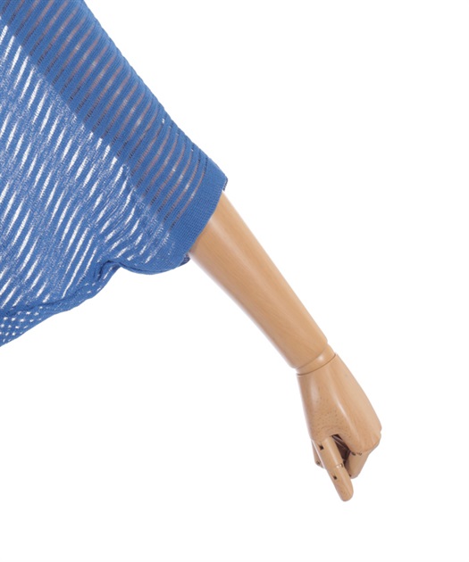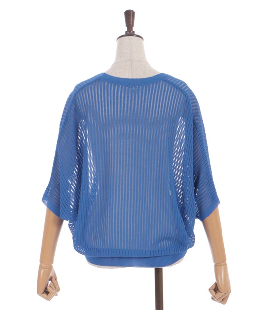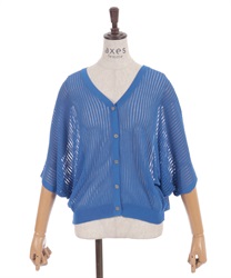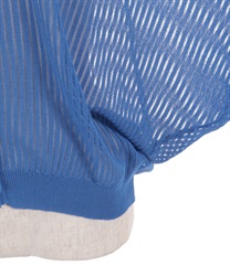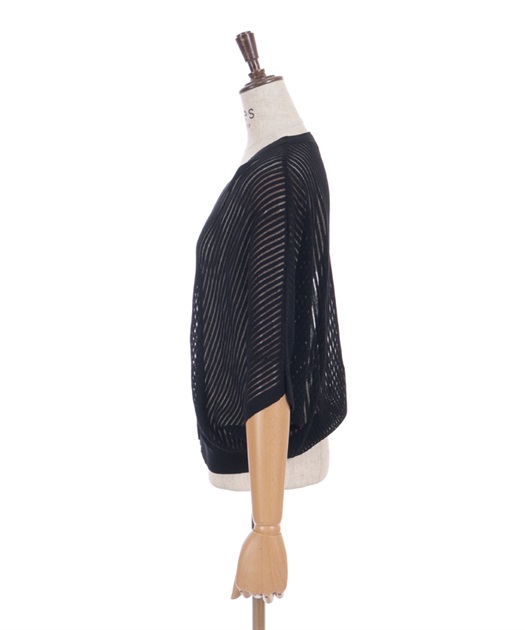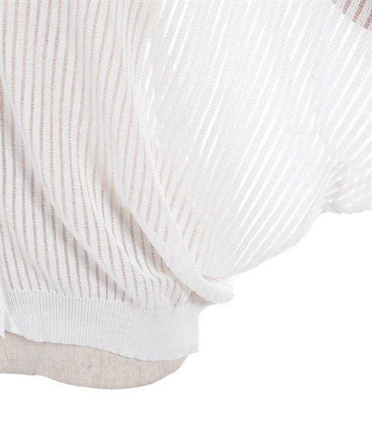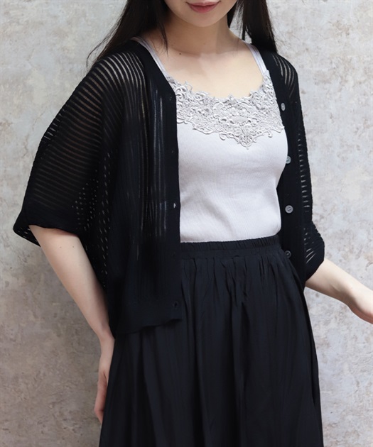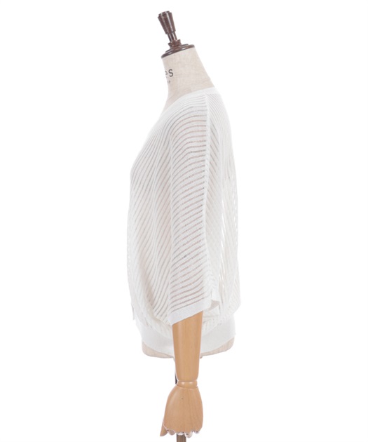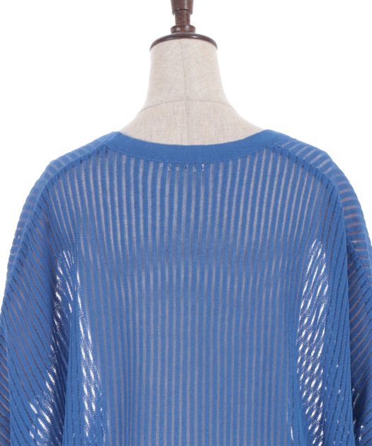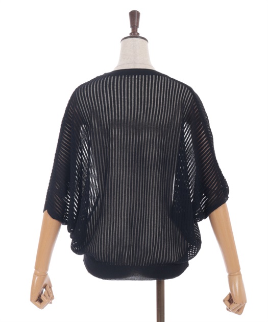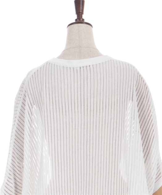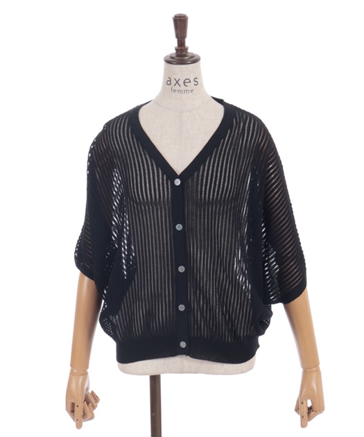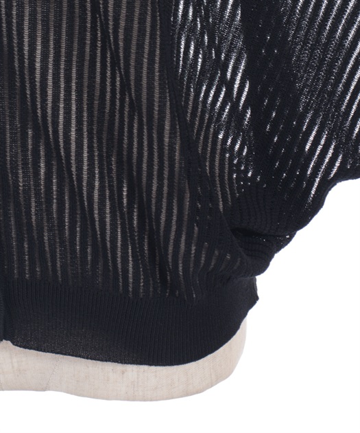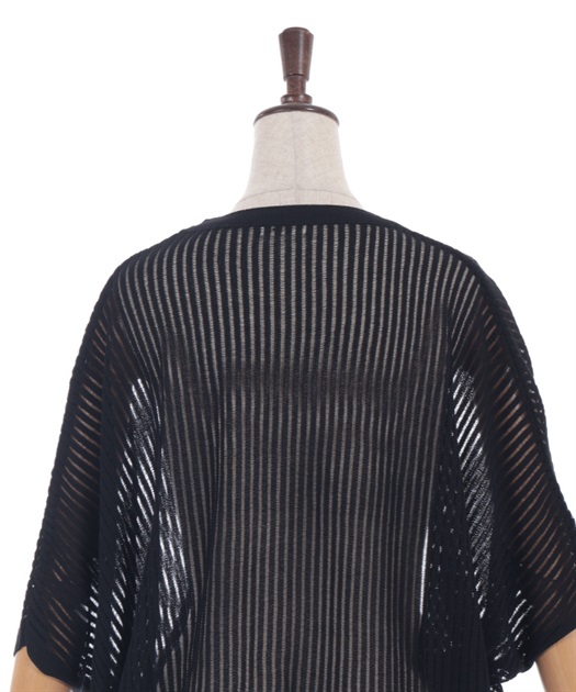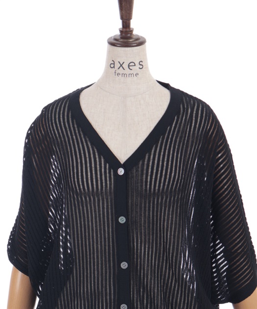 縦ラインを強調するストライプ編みで、すっきりとした印象に。程よくゆとりのあるシルエットと、前開きデザインが抜け感を演出します。メッシュ素材ならではの軽さと通気性もポイントです。