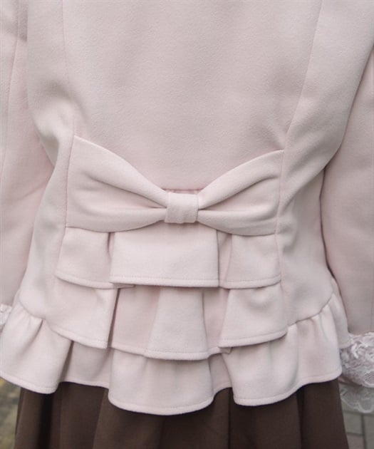 フロントには華やかなカラーのボタンを配置し、ウエストまわりにはフリルをあしらった可愛らしいデザイン。袖口にはレースフリルのアクセントをプラスし、ベロアリボンとバラモチーフのブローチがセットで付属する豪華仕様です。後ろには大きなリボンとフリルデザインで存在感のあるデザインをプラス。