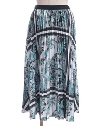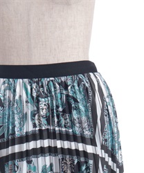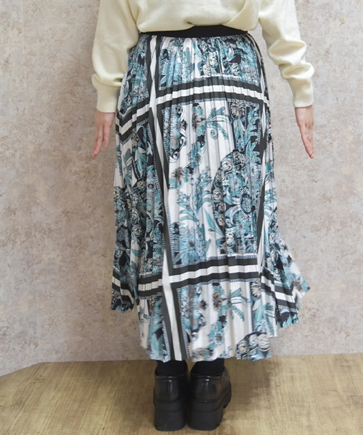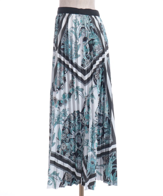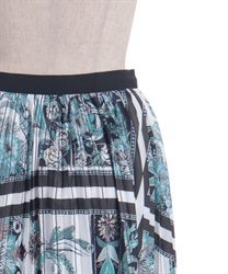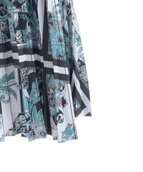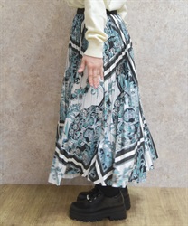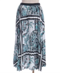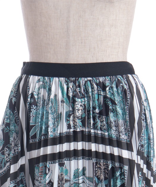 フラワーモチーフとストライプ調の切り替えが印象的なプリーツスカート。歩くたびに揺れるシルエットが、上品で華やかな雰囲気を演出します。