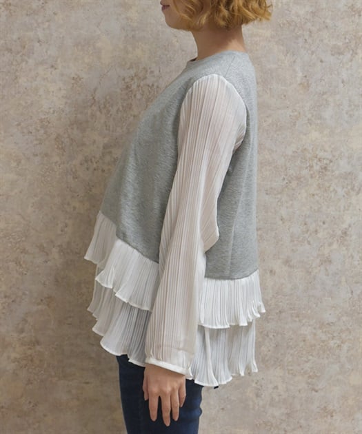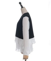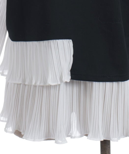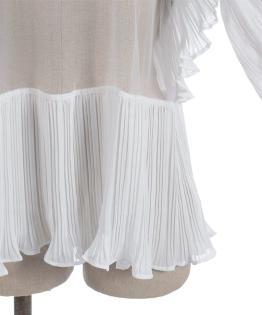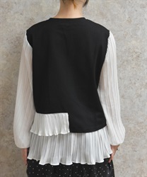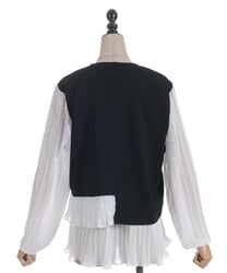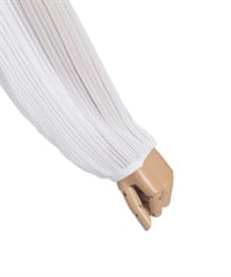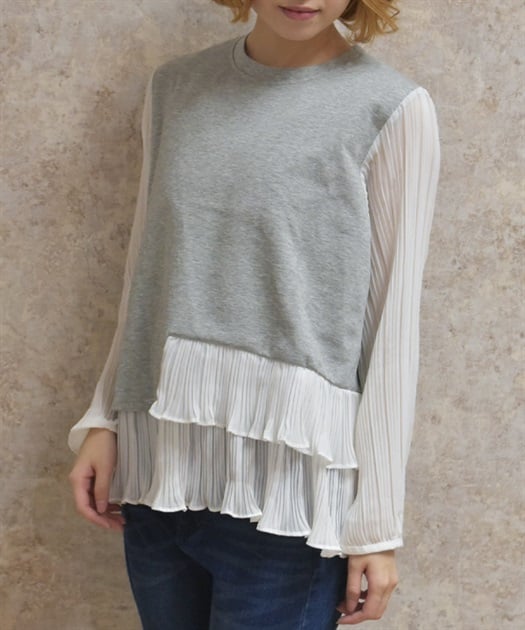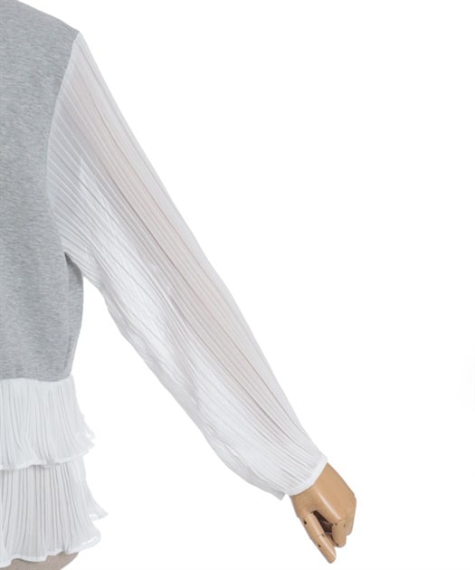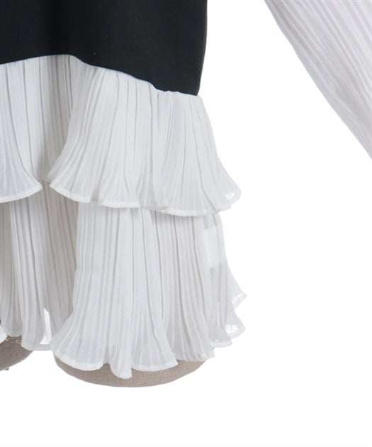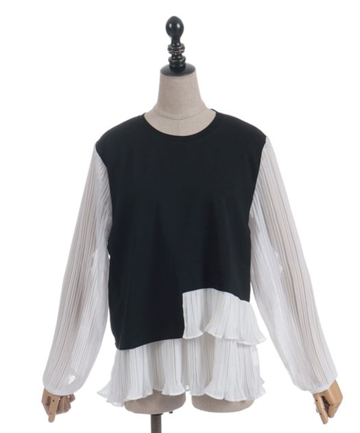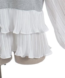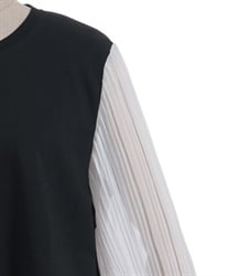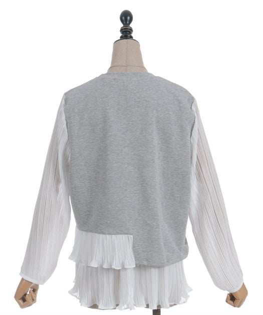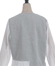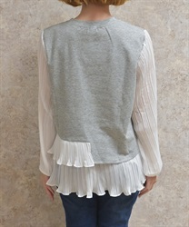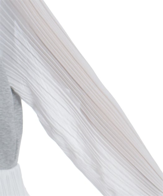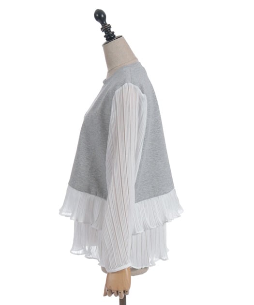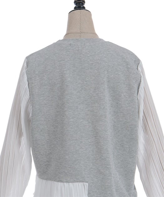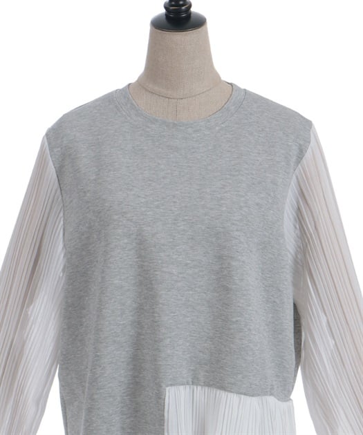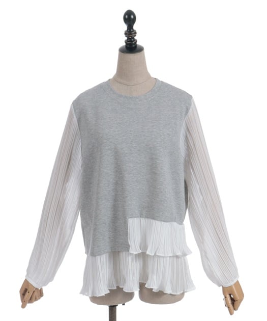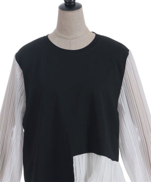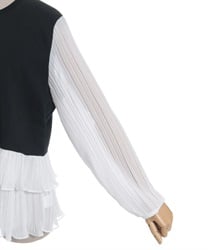 身頃はすっきりとシンプルにまとめつつ、袖に異素材を重ねた立体感のある仕上がりがポイントです。動くたびにふんわり揺れるシルエットで、甘さをほどよく効かせた上品な印象にまとまります。