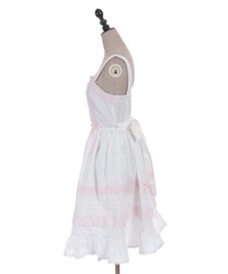 衿元、前身頃、スカート裾、後ろウエストリボンの先に梯子レースを贅沢にあしらったデザインです。マットサテンリボンを使用しております。綿タッチの素材感で通年通してご着用いただけます。