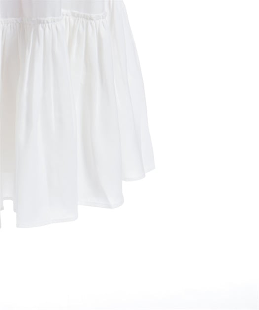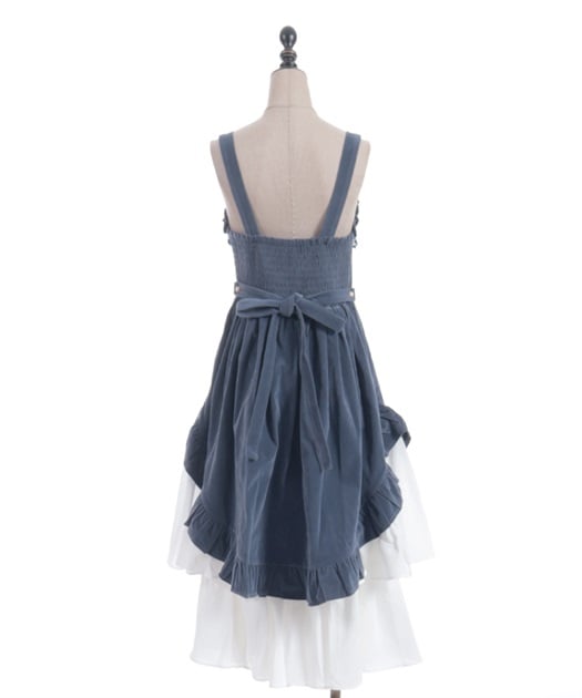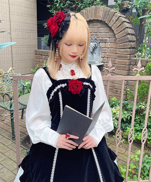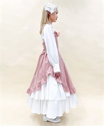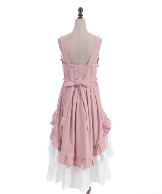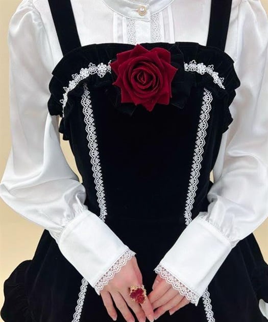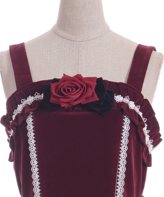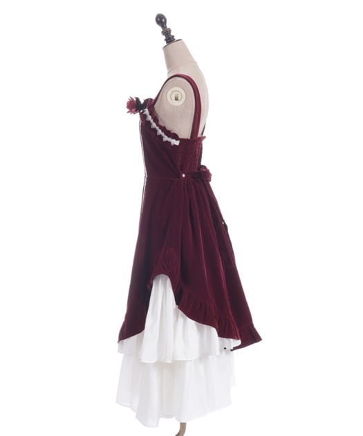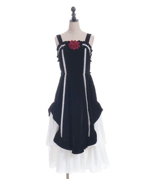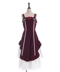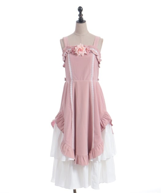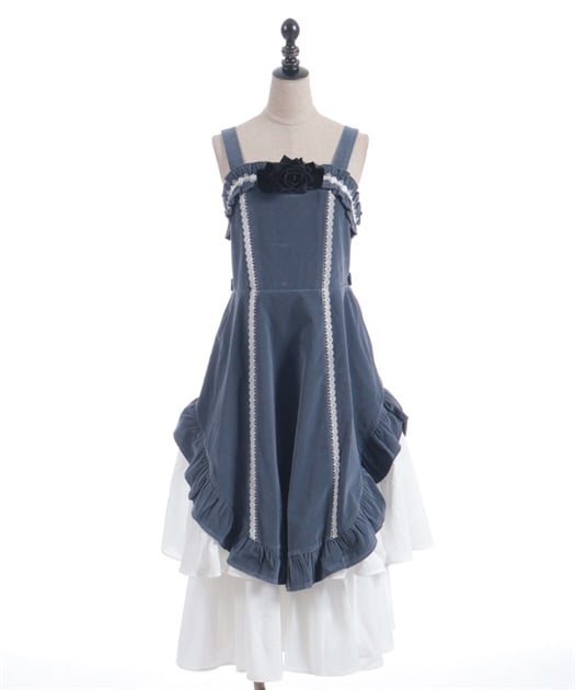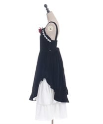 ウエスト周りがすっきりした裾広がりのラインに異素材のフリルがあしらわれています。胸元の薔薇はブローチになっているので取り外し可能です。