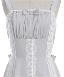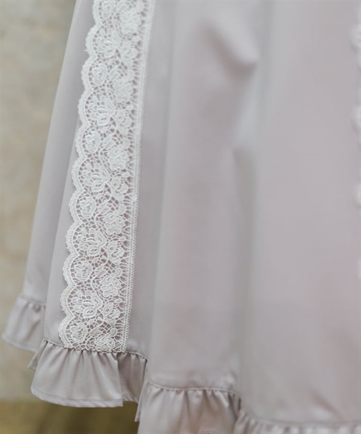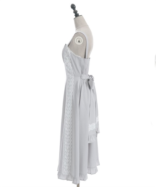 前身頃のウエストにはギャザーがなく、すっきりとしたシルエットが美しいジャンパースカートです。前身頃にあしらったレースがより縦のラインを引き立ててくれるので、より大人らしい凛とした印象になります。