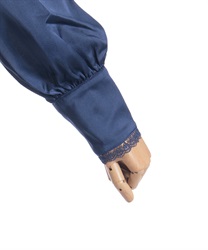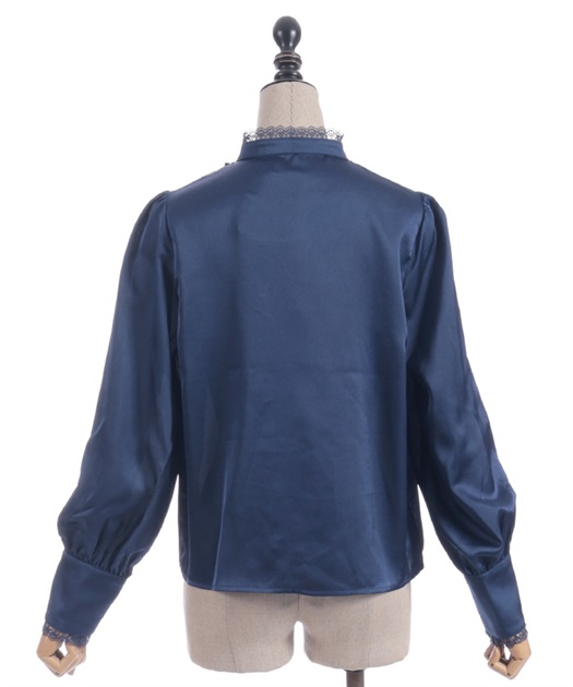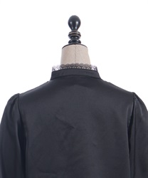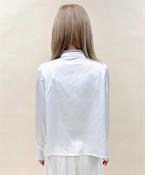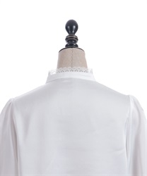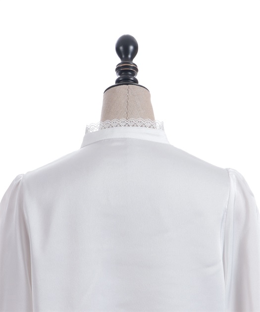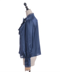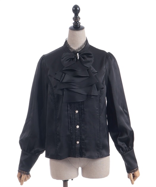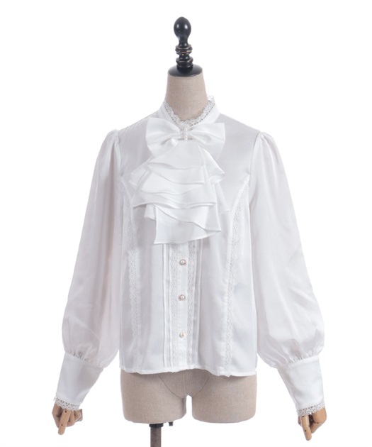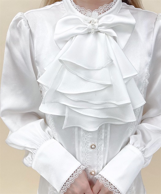 衿元のボリューミーなフリルはブローチになっており、外してシンプルにも使えるブラウスです。リボンの中心にはパールが巻かれたようなデザイン。