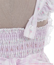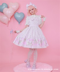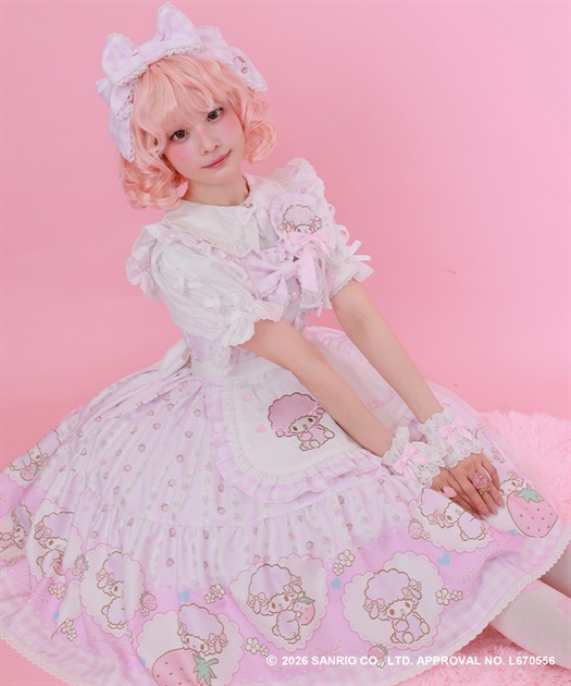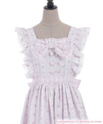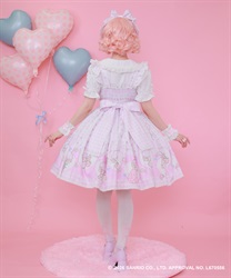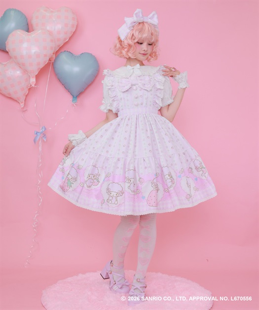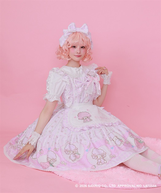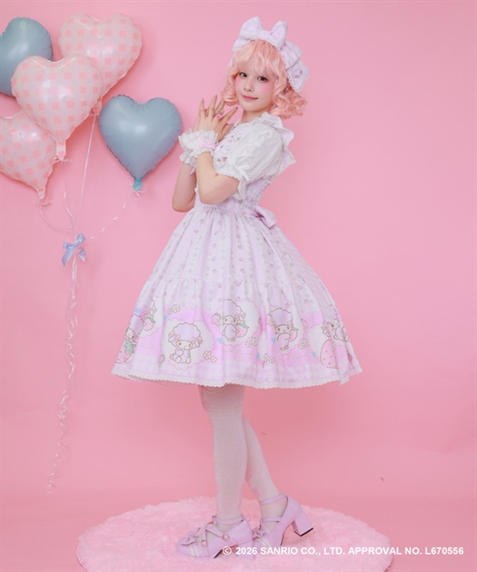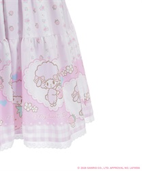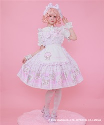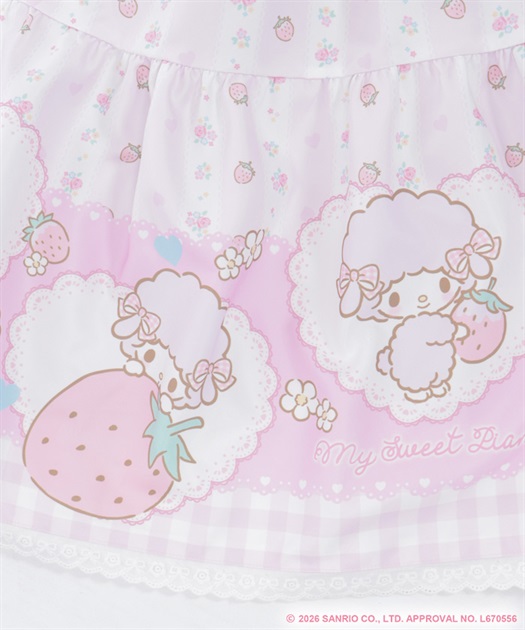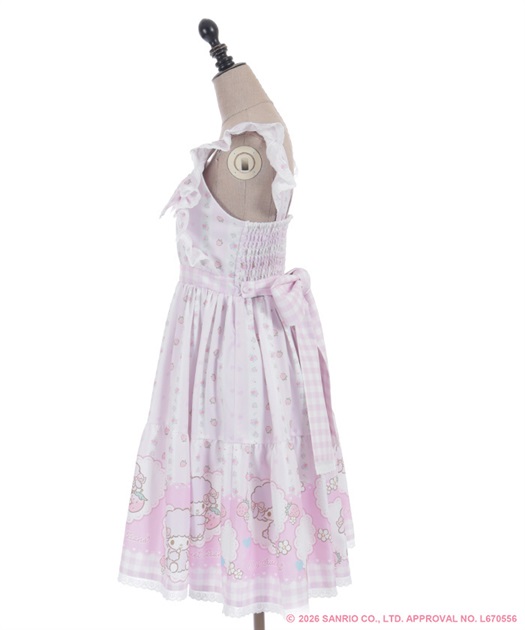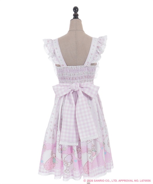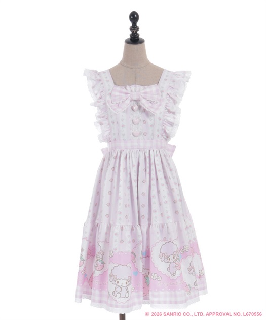 スカートの裾にはマイスウィートピアノがたくさん♡ティアード切り替えになったスカートはパニエをインナーに着用してふんわり広がるシルエットです。胸元には大きなリボンやハート型の釦をあしらったキュートなデザインです。後ろ上身頃はゴム仕様になっており、簡単に着脱が可能です。肩紐の長さは2段階の調節が可能です。後ろウエストリボンは取り外しが可能です。