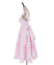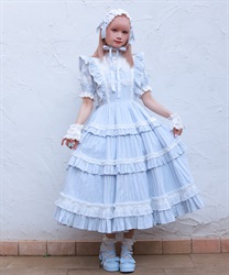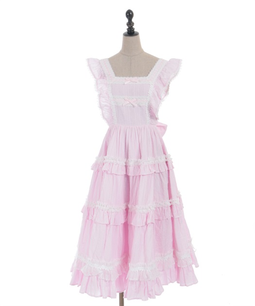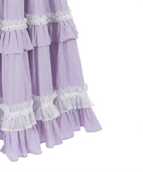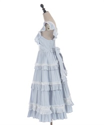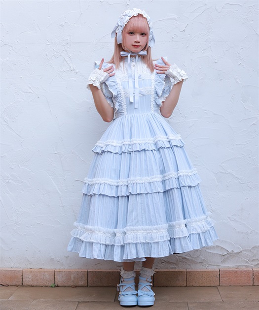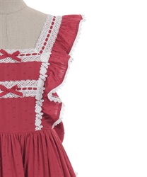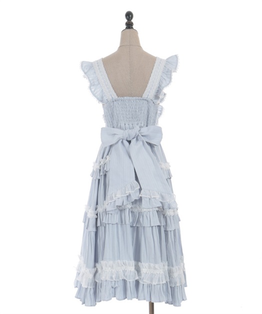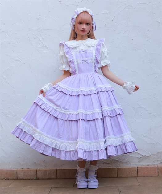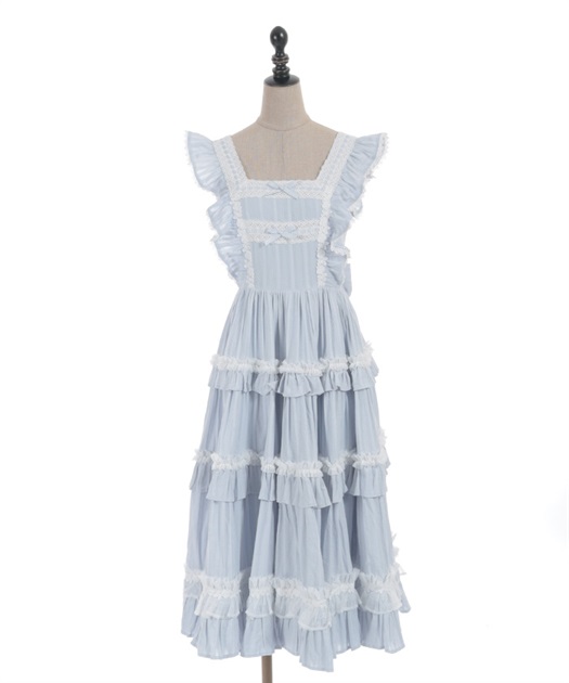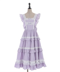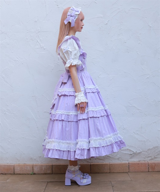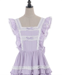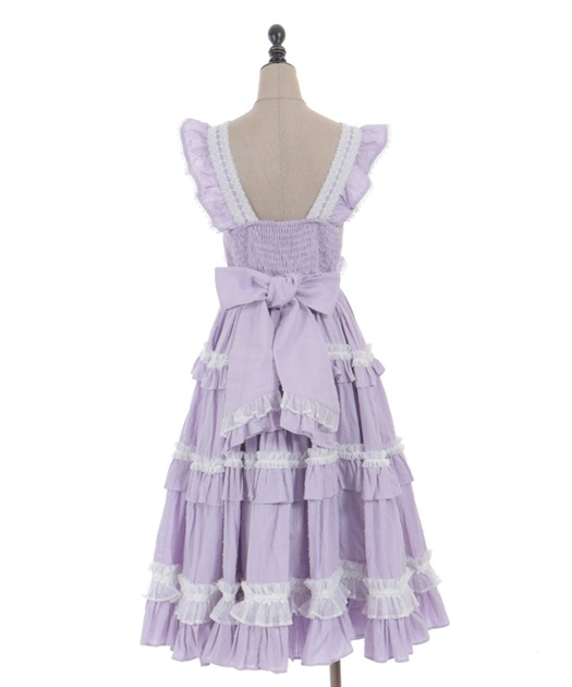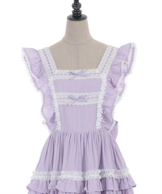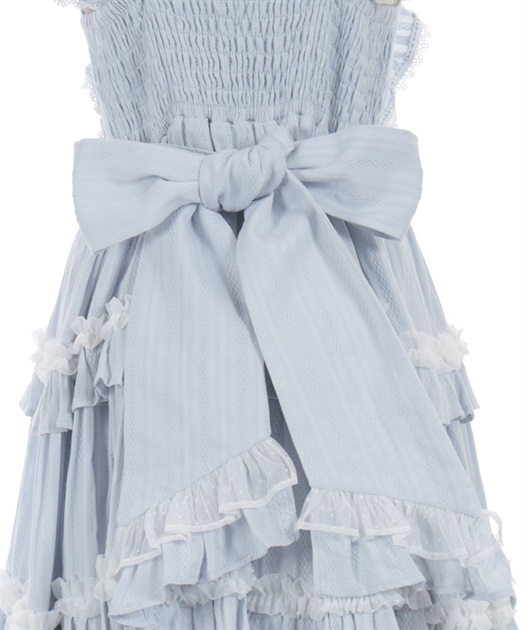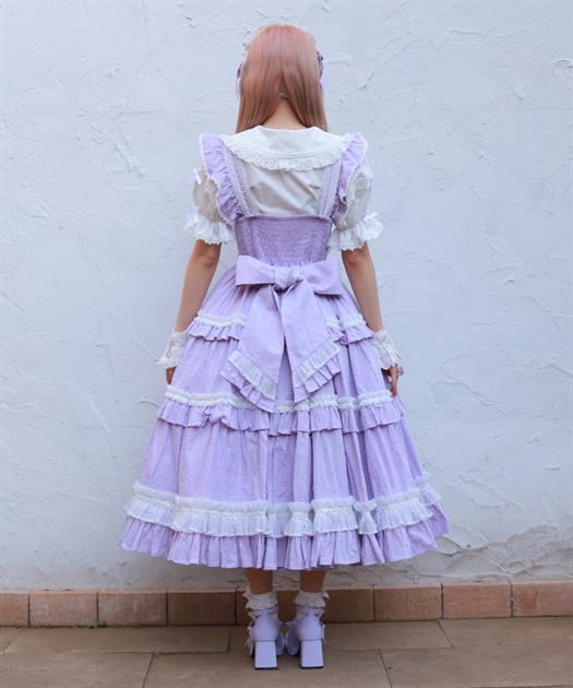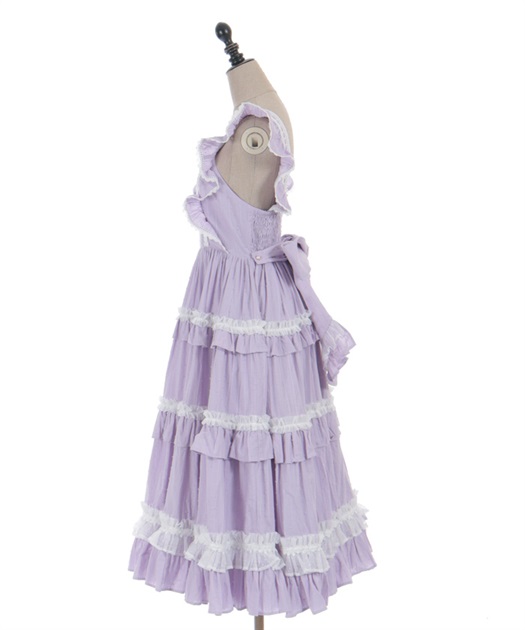 3段切り替えのスカートにはたっぷりギャザーを寄せた贅沢なデザインです。胸元には梯子レースをあしらい、小さなリボンがついています。ショルダーにもフリルをあしらい可愛らしいデザインに仕上げました。カラミドビー生地を使用した春夏にぴったりなジャンパースカートです。