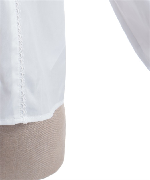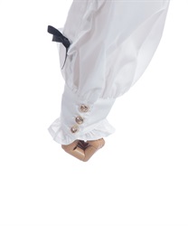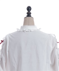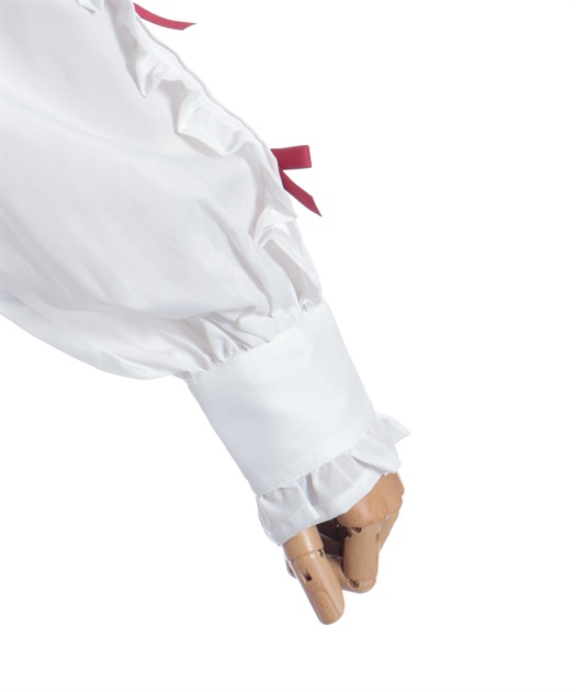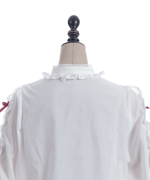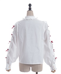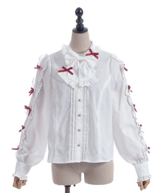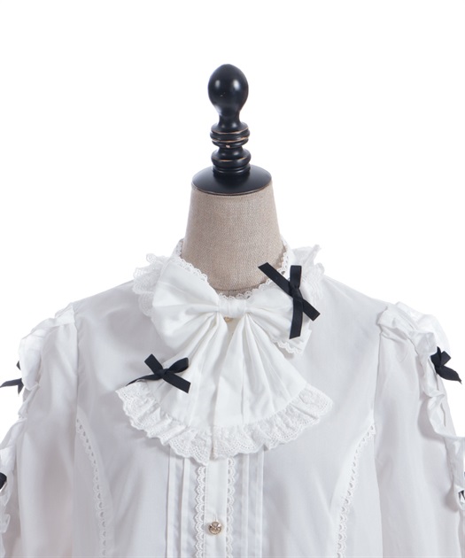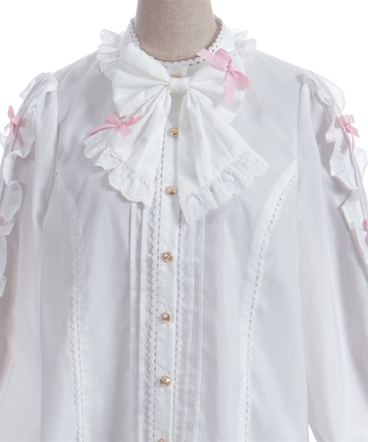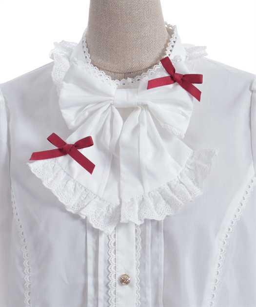 配色になったリボンがポイントのブラウスです。合わせやすい白のブラウスに沢山あしらわれたリボンが可愛らしい1着。襟元のリボンはブローチになっているので取り外しが可能です。