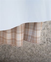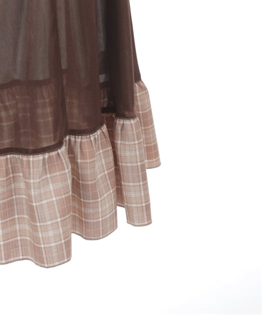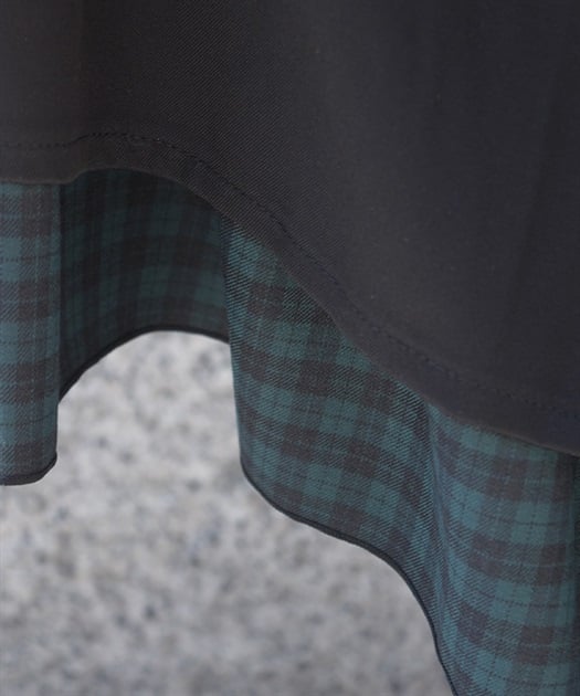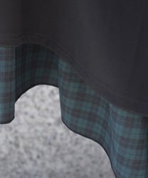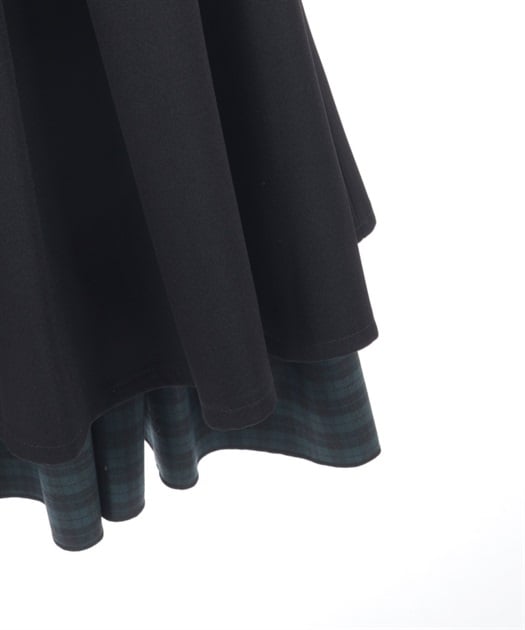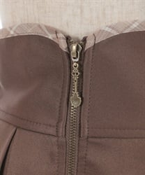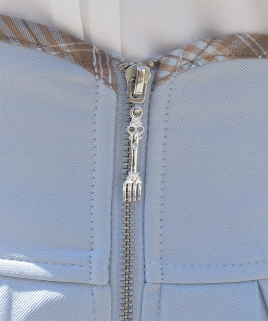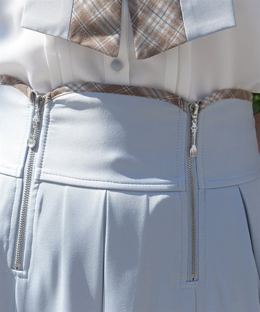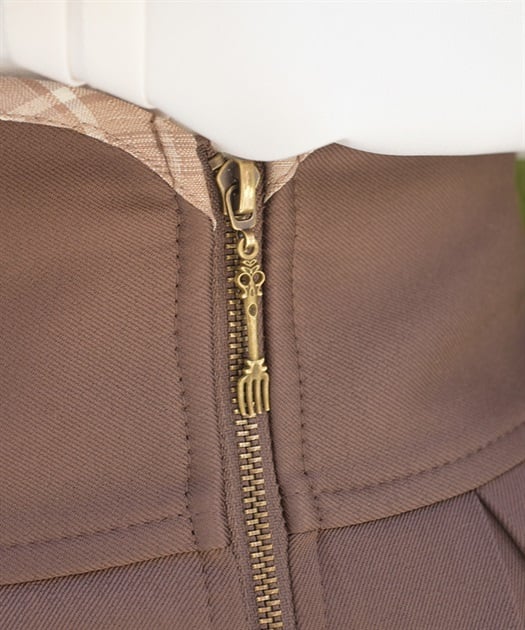ウエスト部分のファスナートップには左右で異なるカトラリーデザインチャームをあしらい、細部までこだわりを感じさせる仕上がりです。裾にさりげなく覗くディテールが動きに奥行きを生み、クラシカルなムードを高めます。