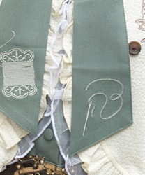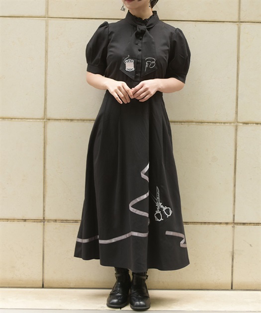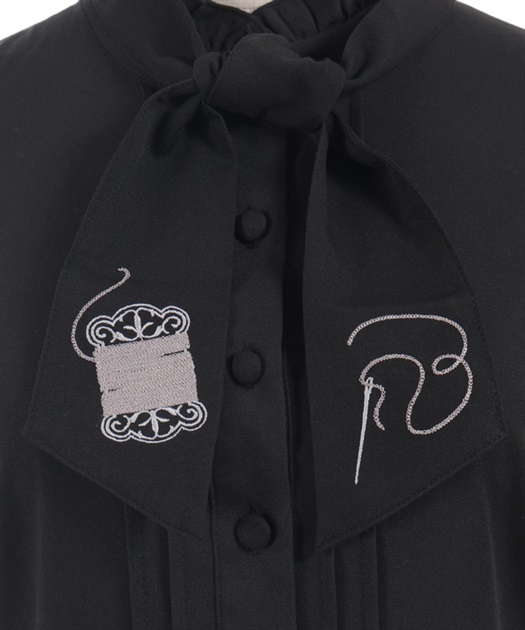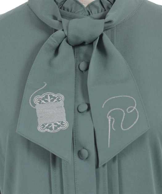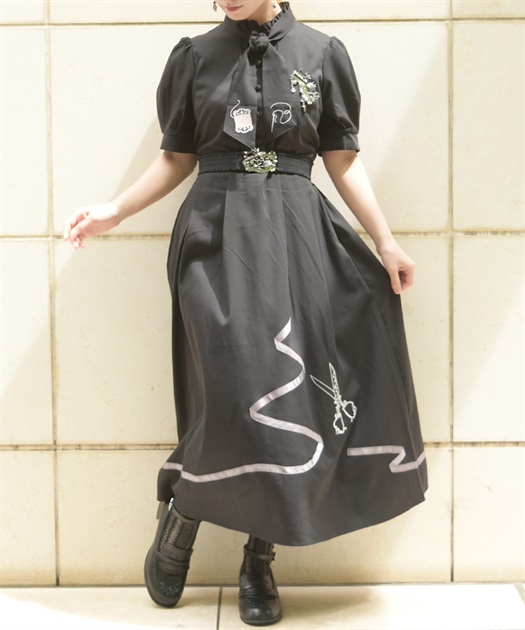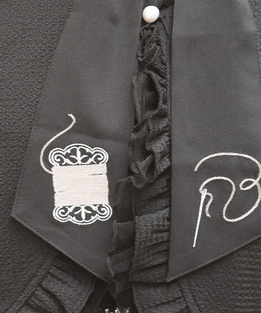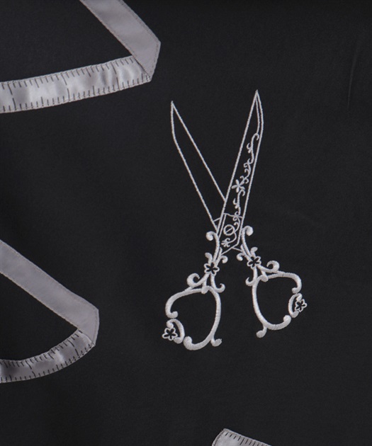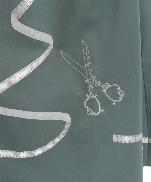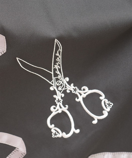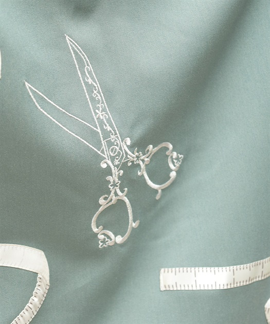 タイには糸巻と針のアソート刺繍を施し、スカート部分には装飾が綺麗な鋏の刺繍を大きく施しています。