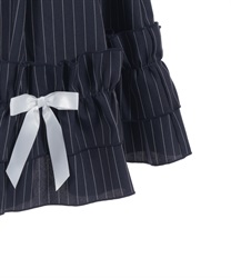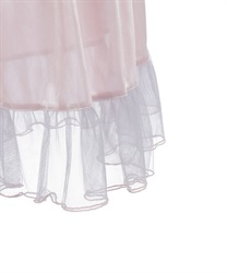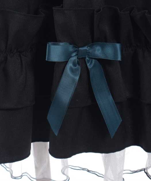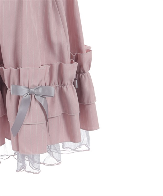 裾に向かってボリュームが増すシルエットが印象的で、動きに合わせて立体感のあるラインを描く一着。リボンディテールがアクセントとなり、軽やかなニュアンスをプラスしています。裾にはチュールを重ねて透け感を加え、配色メローがさりげないコントラストを演出。後ろはレースアップとゴム仕様で、フィット感と美しいシルエットを両立しています。