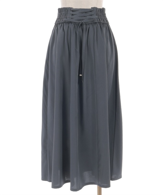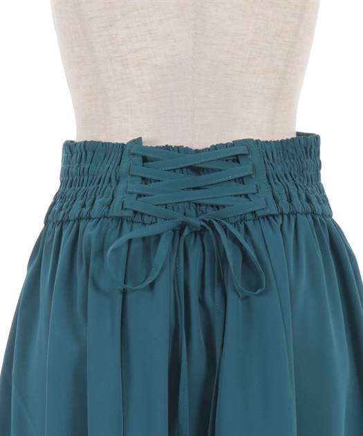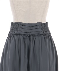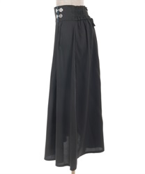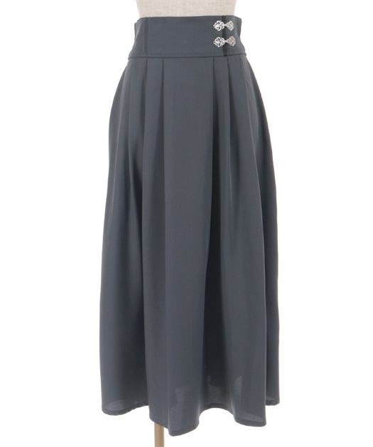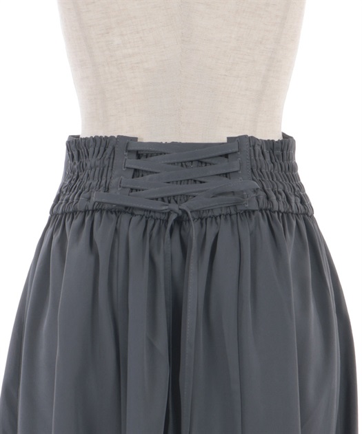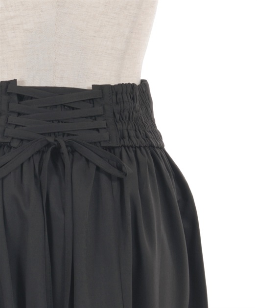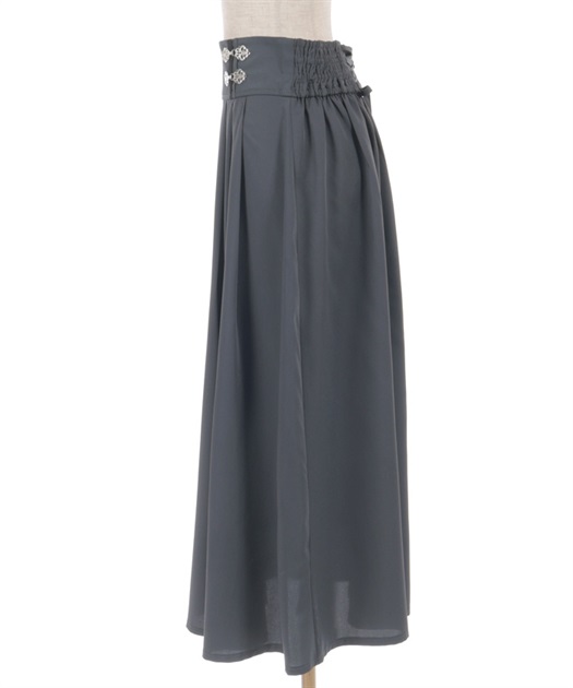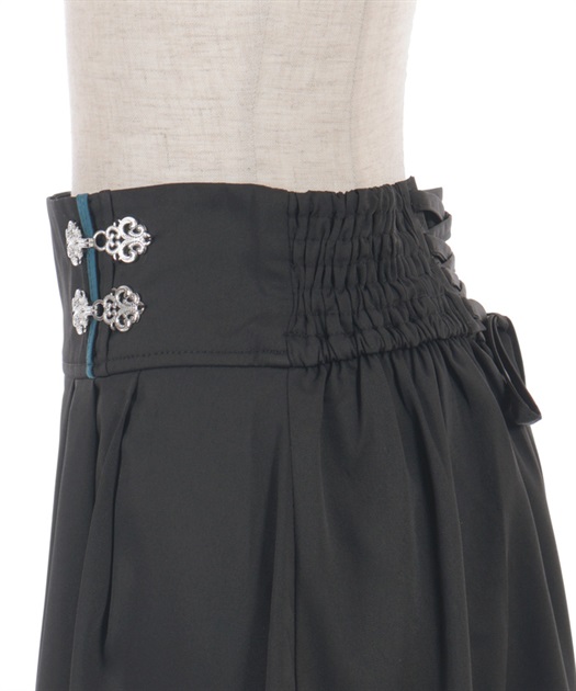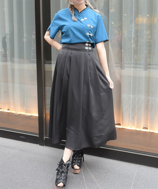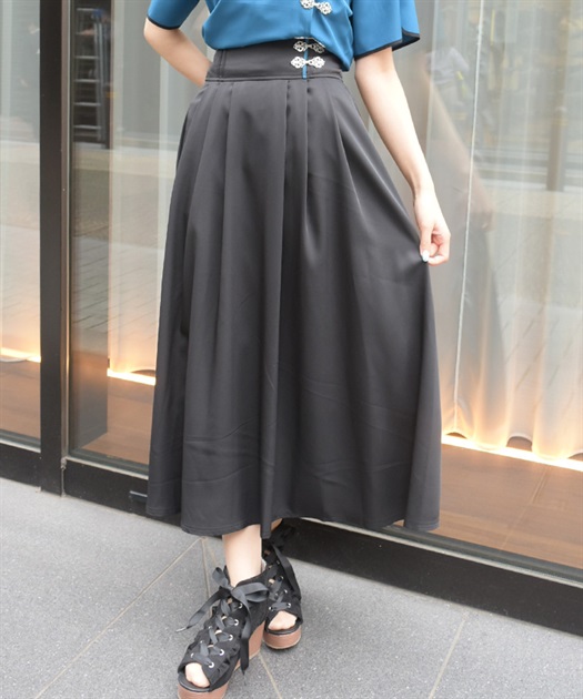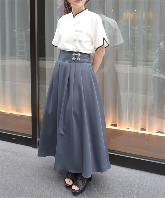 ウエスト部分にあしらったチャイナボタンがアクセントとなり、さりげなく個性を感じさせる一着。タックから広がるシルエットが美しいラインを描き、落ち着いた印象に仕上げています。シンプルな中にディテールが映えるデザインです。後ろはゴム仕様×レースアップデザインのためお好みで調整ができます。