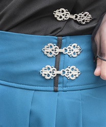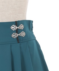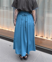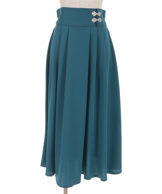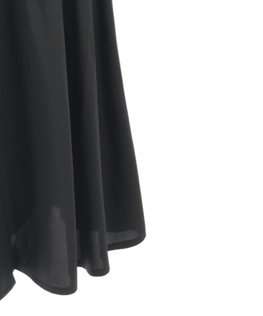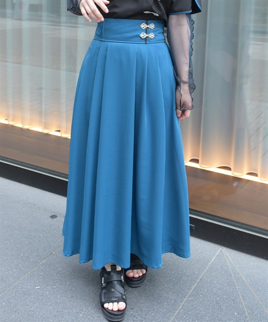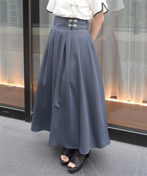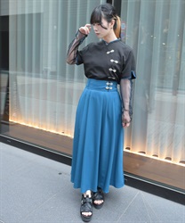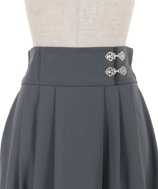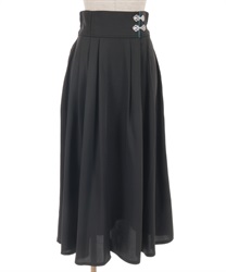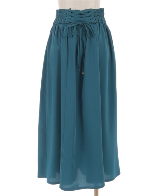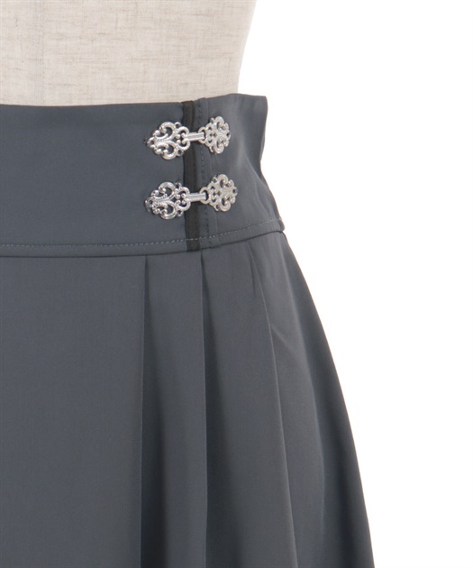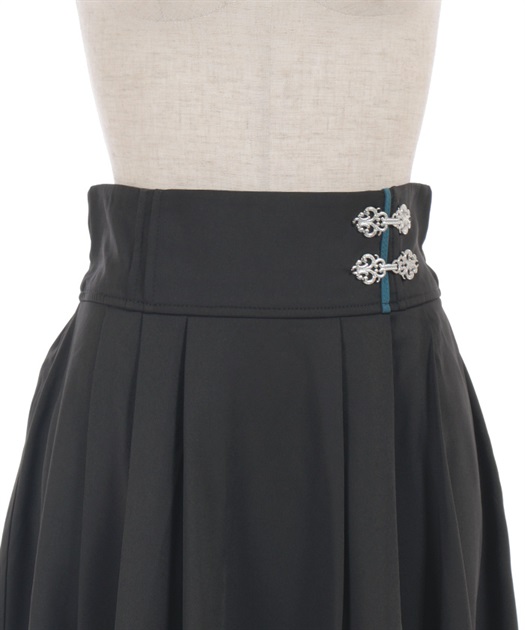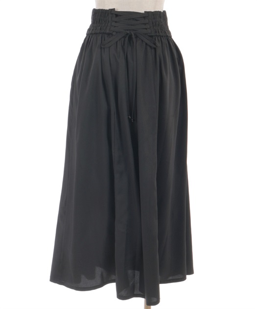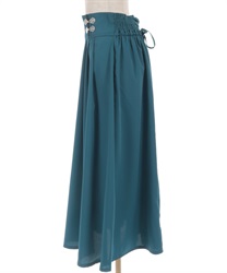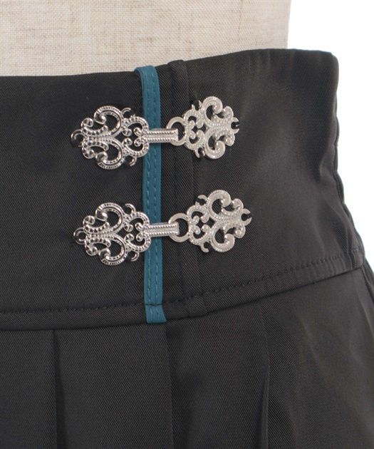 ウエスト部分にあしらったチャイナボタンがアクセントとなり、さりげなく個性を感じさせる一着。タックから広がるシルエットが美しいラインを描き、落ち着いた印象に仕上げています。シンプルな中にディテールが映えるデザインです。後ろはゴム仕様×レースアップデザインのためお好みで調整ができます。