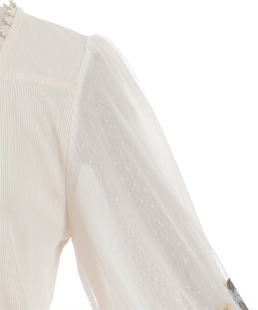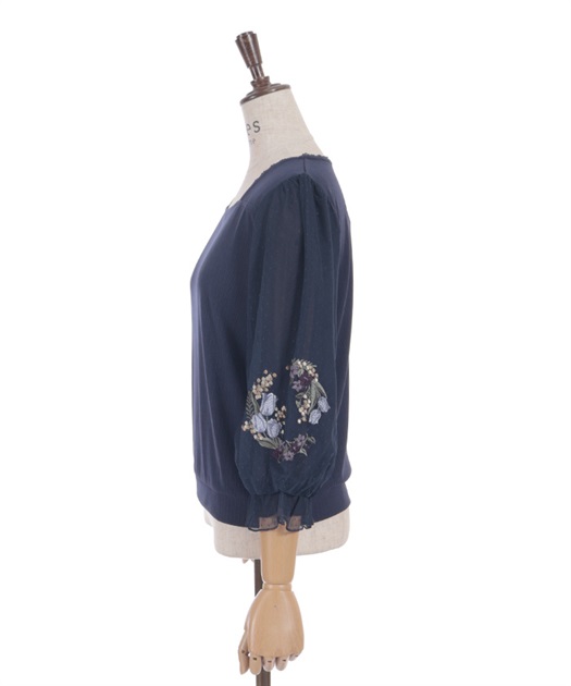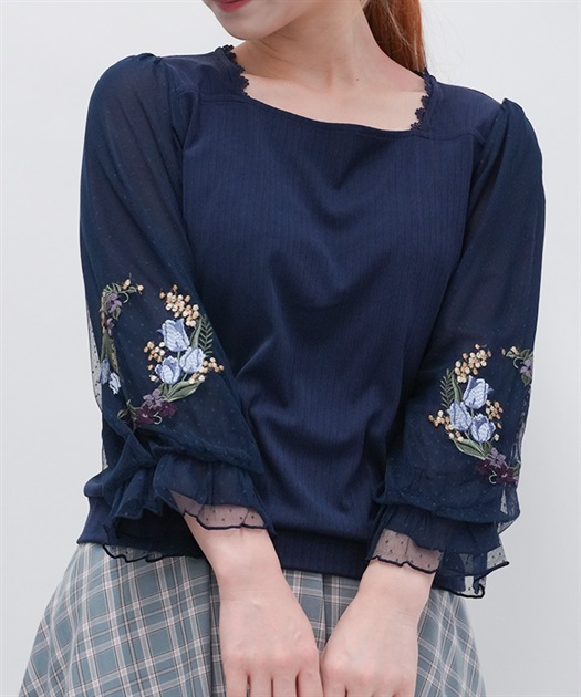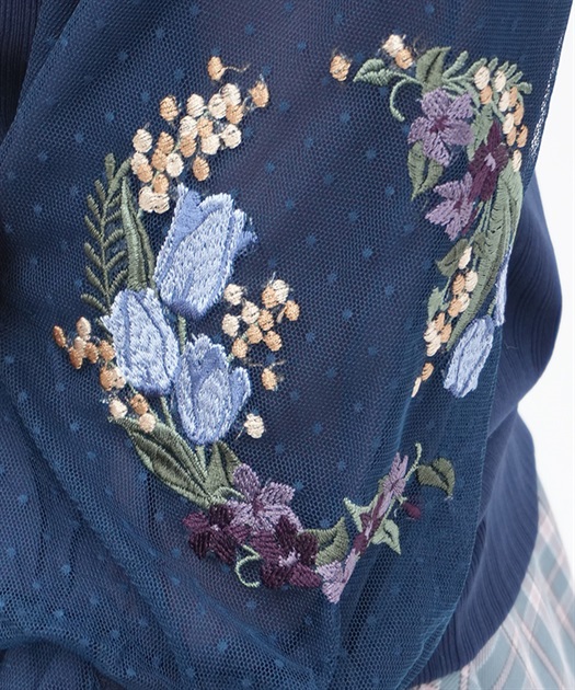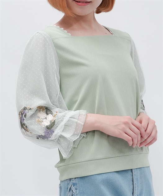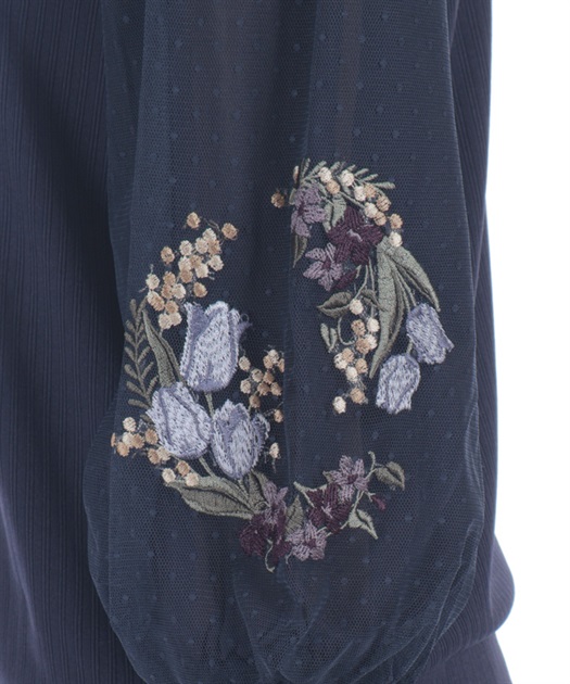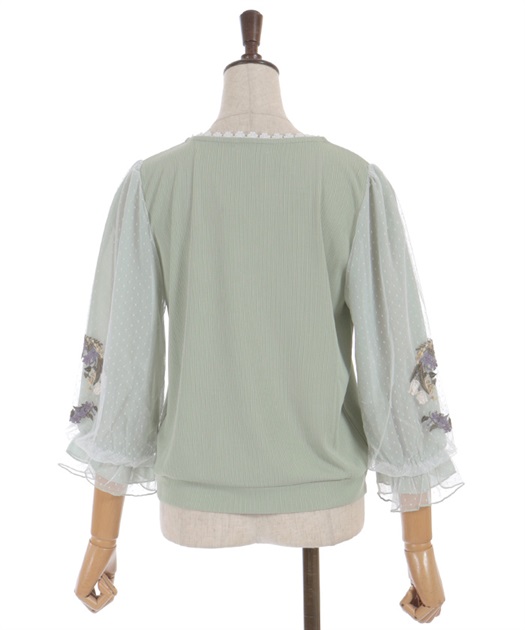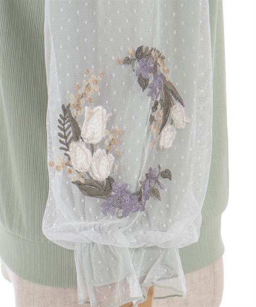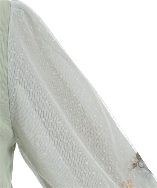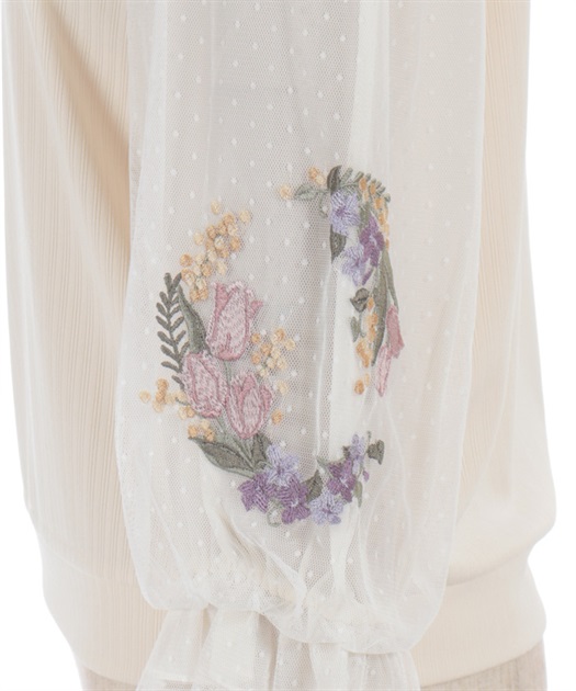 トレンドライクなドットチュール×刺繍の袖デザインがポイントのトップスです。