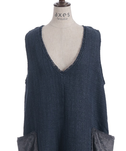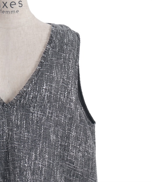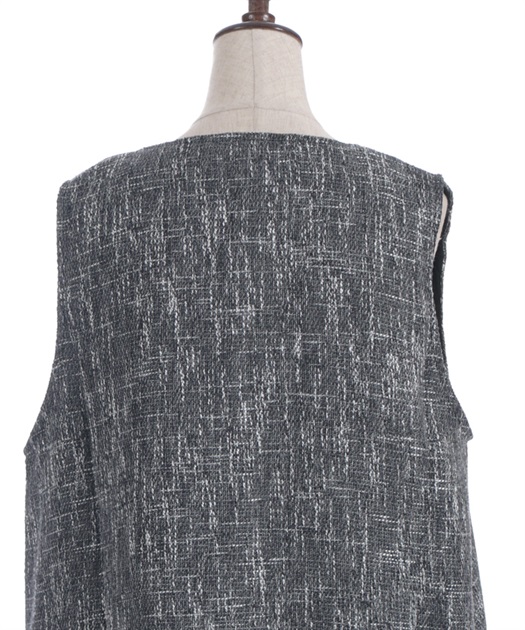 深めのVネックラインで顔まわりをすっきりと見せ、インナー次第で雰囲気を変えられるのが魅力。ツイードの質感がクラシカルな印象を与えつつ、ふんわりとしたポケットのディテールが可愛らしいアクセントになっています。